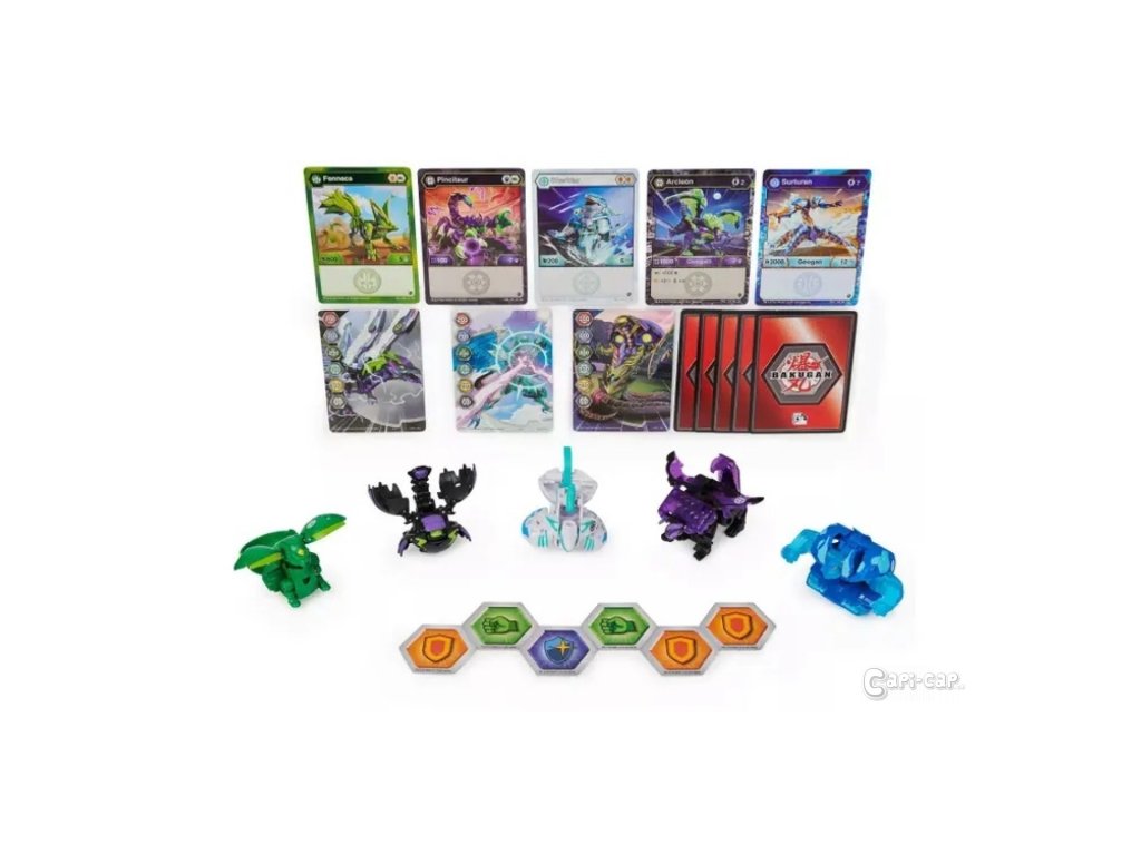 Sada obsahuje 2 exkluzívne Bakugany + 3 menšie Bakugany, 6 Bakužetónov, 3 karty charakteru, 7 kariet schopností, 3 karty tréningu, 1 inštrukcie a pravidlá.