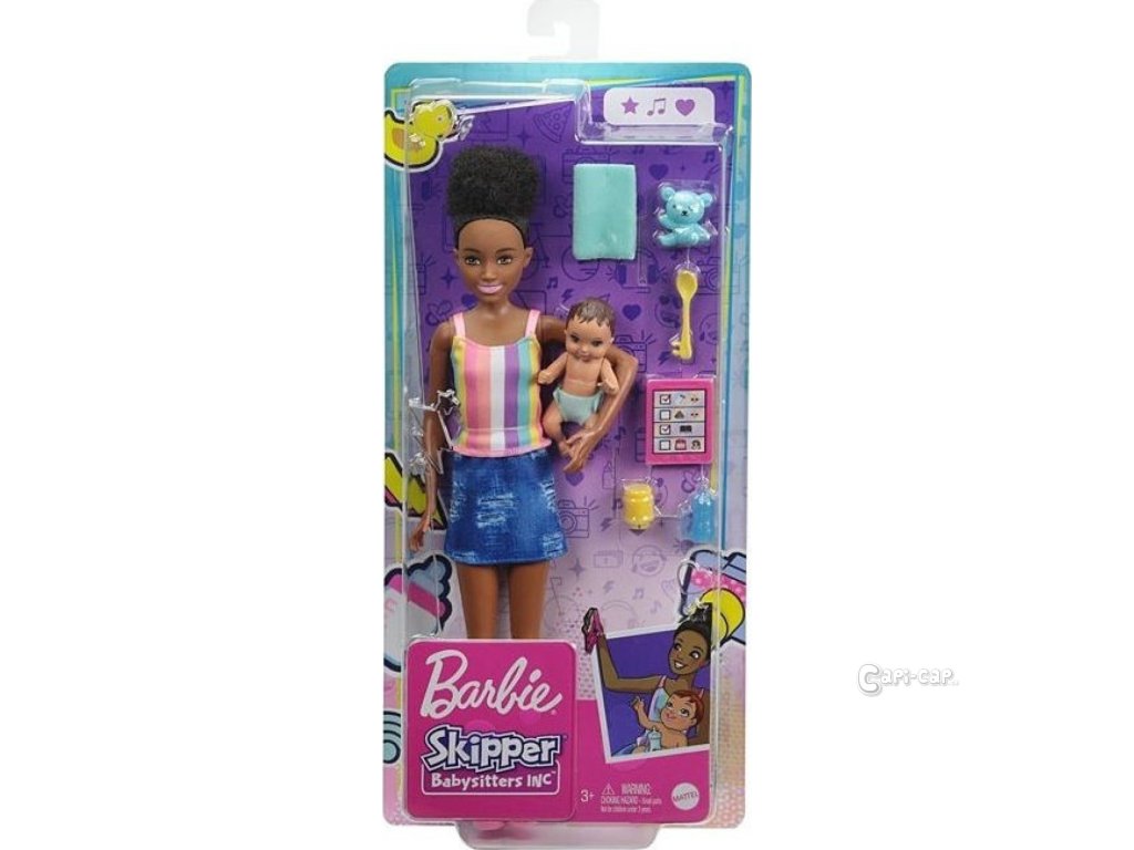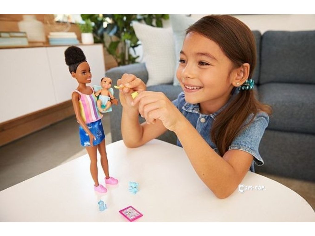 Malé děti mohou být chůvou díky panence Barbie® Skipper ™ Babysitters Inc. ™ a sadami příslušenství, které obsahují panenku Skipper ™, panenku miminka a rekvizity pro vyprávění příběhů, které pomohou hravě ztvárnit okamžiky péče o dítě.