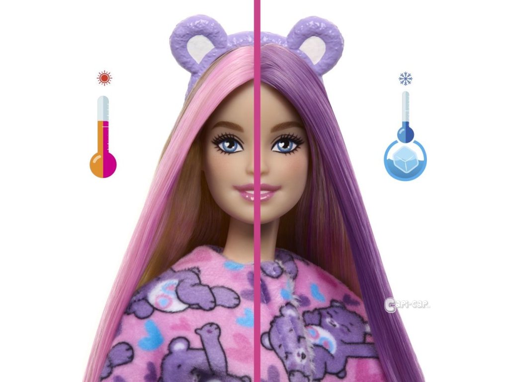 Panenky Barbie® Cutie Reveal™ Starostliví medvídci přinášejí ten nejroztomilejší zážitek z rozbalování s 10 překvapeními! Objevte jednu ze tří různých postaviček - veselého medvídka, rozverného medvídka nebo mrzutého medvídka. Sundejte rozkošný plyšový kostým a odhalte polohovatelnou panenku Barbie®. Kterou panenku odhalíte? Najděte také další překvapení, například sukni, čelenku, sluneční brýle, boty, houbičkový hřeben a medvídka! Použijte vodu pro opakovanou proměnu barvy vlasů panenky! Panenky se prodávají samostatně dle aktuální nabídky.