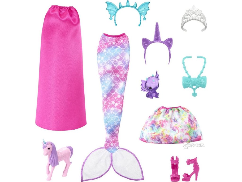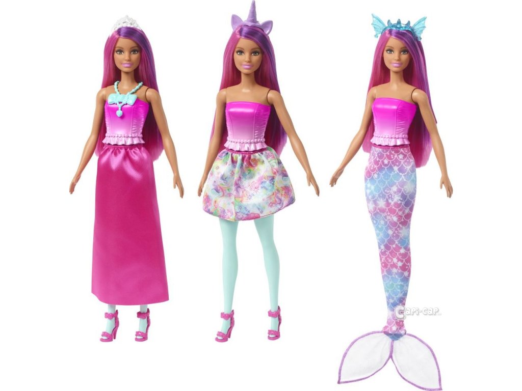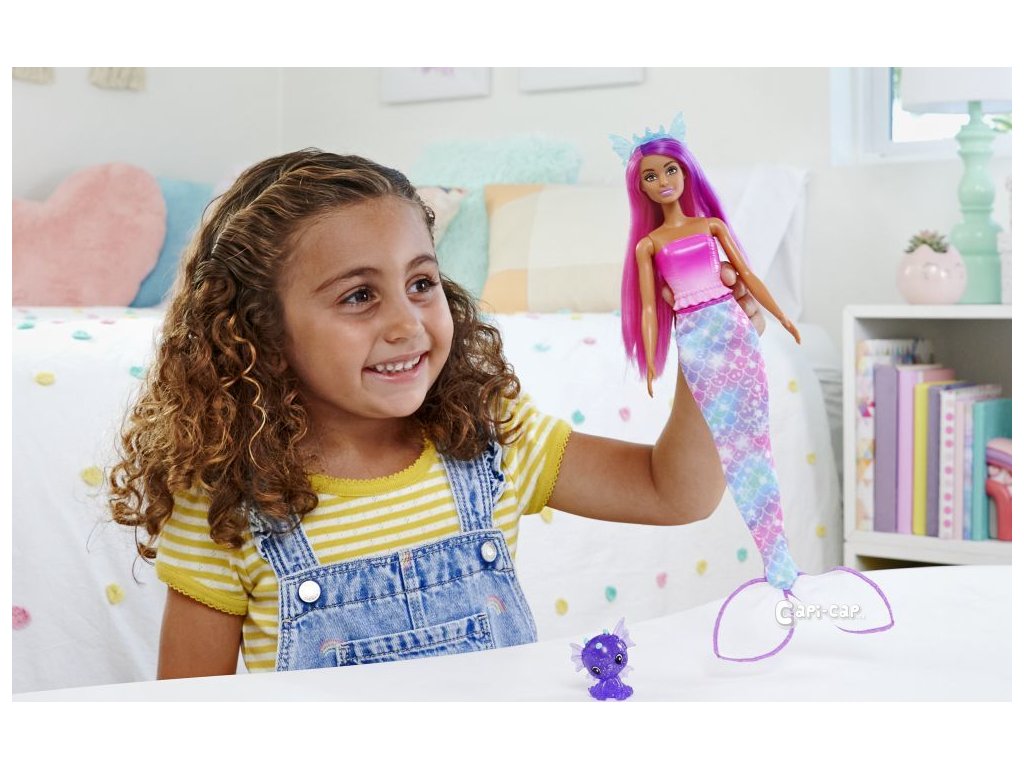 Tato Barbie® panenka s pohádkovými oblečky a růžovo-fialovými vlasy nabízí možnost přeměny díky mnoha módním doplňkům, mezi které patří ocas mořské panny, dvě sukně, čelenky a náhrdelník s motivem jednorožce a draka. Vytvoř si z panenky pomocí oblečků princeznu, mořskou pannu nebo třeba jednorožčí vílu. Součástí této snové sady jsou také malý jednorožec a drak pro ještě více pohádkových her. Panenka neumí samostatně stát. Barvy a vzhled výrobku se mohou lišit.