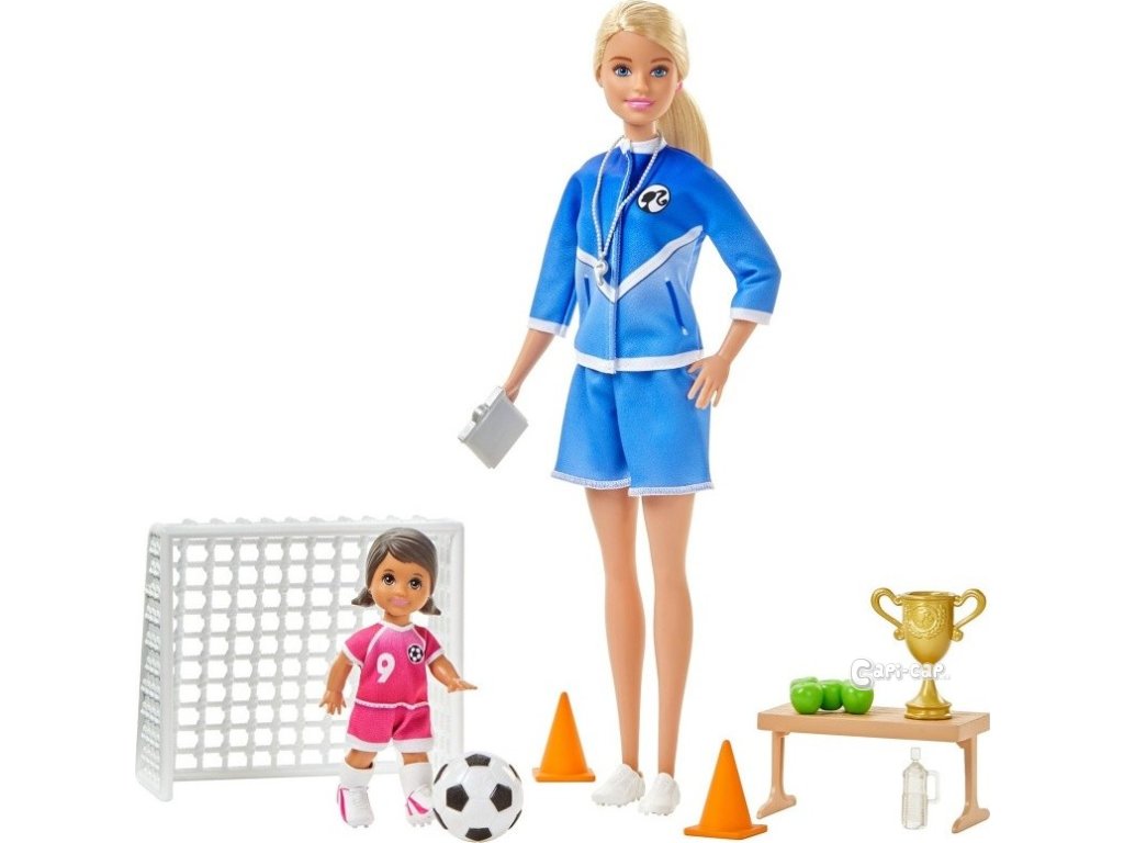 V hernom sete nájdeš trénerku Barbie®, malú futbalistku a nechýba samozrejme ani futbalová lopta, bránka, lavička a ďalšie doplnky, s ktorými trénovanie aj zápasy budú ešte väčšia zábava. Niektoré doplnky sú vytvorené tak, že ich bábiky môžu pohodlne uchopiť. Obe bábiky sú oblečené do športového oblečenia a už sa nemôžu dočkať, až spoločne začnete trénovať!