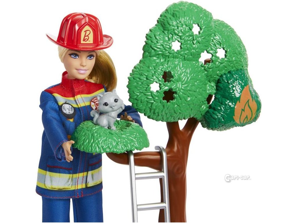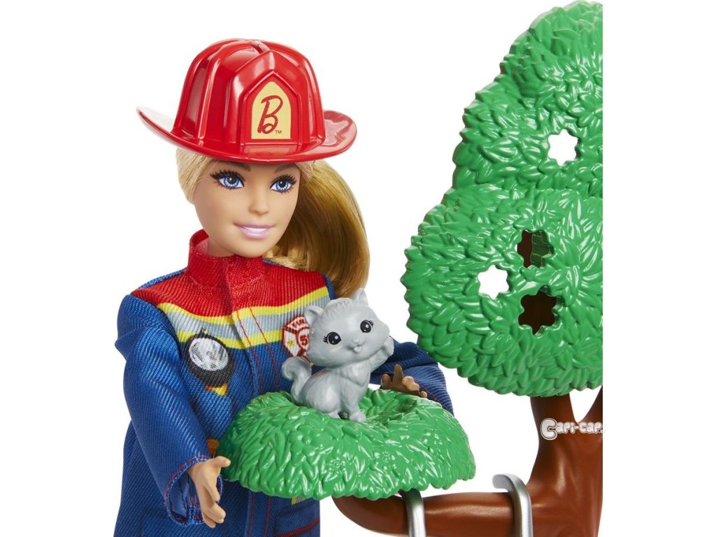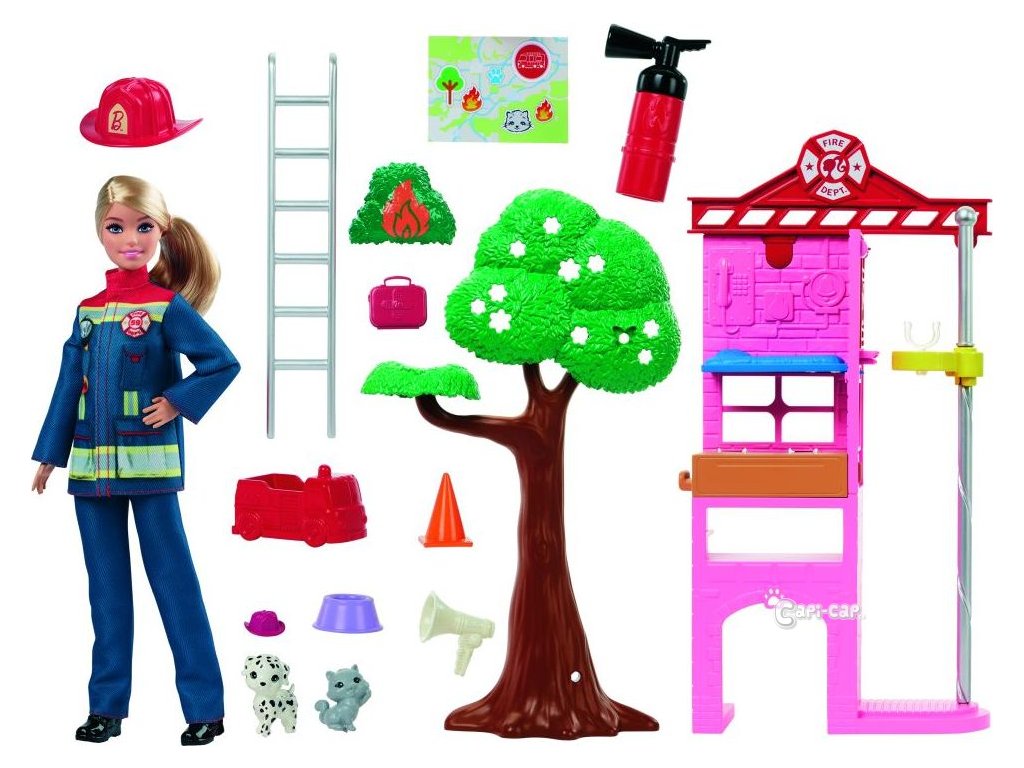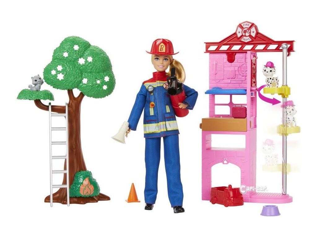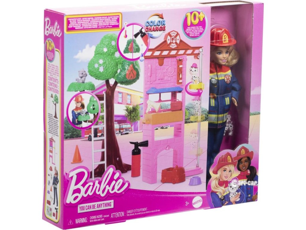 Barbie® Hasičská stanice s panenkou, která obsahuje více než 10 doplňků, umožňuje dětem probudit v sobě hrdiny! Přehrávejte si záchranu koťátka na stromě nebo bojujte s požárem s interaktivními dílky. Součástí setu je strom s otvory na kolíky, stříkací hračka hasicího přístroje - studená voda uhasí oheň! Panenka Barbie® hasička v uniformě a s megafonem je připravena vyrazit ze stanice se svým mazlíčkem štěnátkem dalmatina.