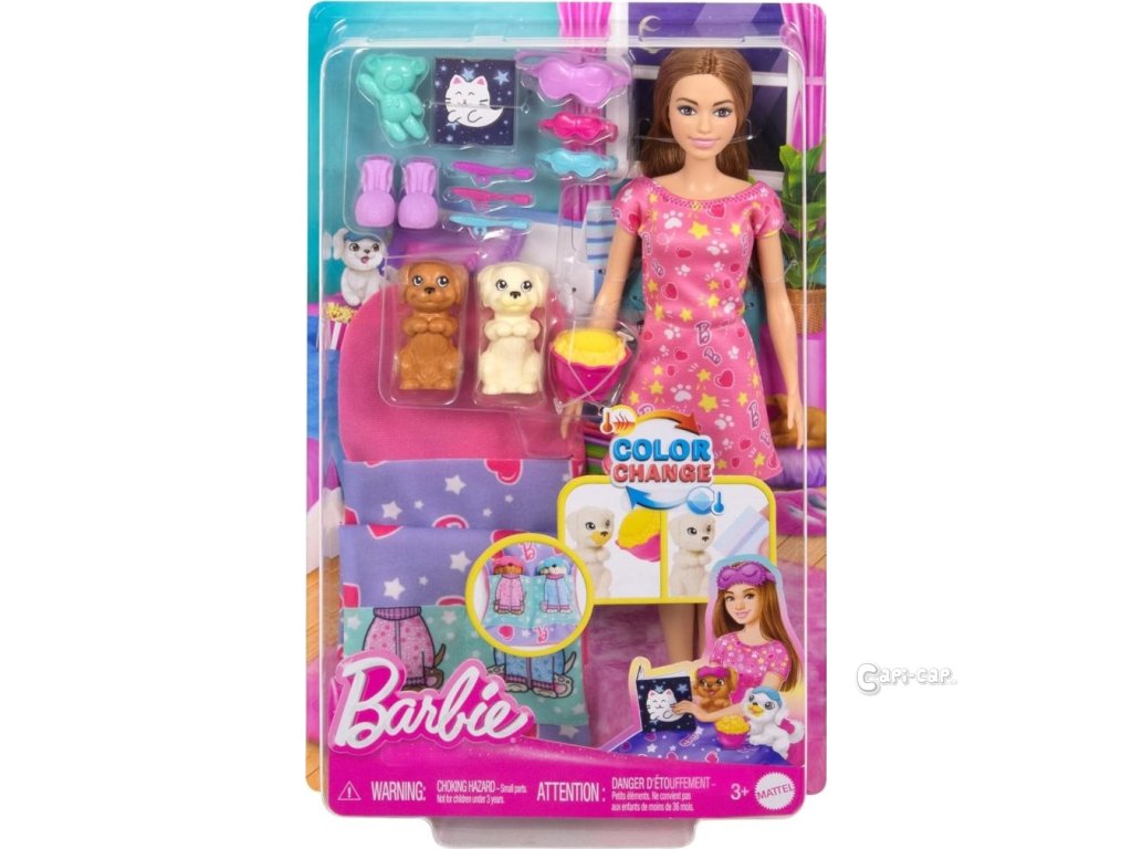Tato herní sada obsahuje panenku Barbie, dvě rozkošná štěňátka, spací pytel, do kterého se vejdou všichni tři, a 10 doplňků. Pro zábavu se změnou barev mohou děti přeměnit tvář štěněte z čisté na máslovou pomocí ledově studené a teplé vody. Panenka Barbie, připravená na zábavnou noc, má na sobě noční košili a pantofle. Každý má oční masku pro sladké sny při spánku! Panenka nemůže stát sama.