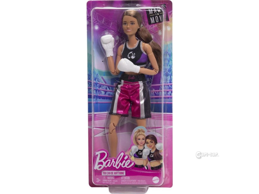 Panenka Barbie® Sportovkyně - boxerka je připravena na zápas! Panenka má na sobě parádní boxerskou soupravu a je připravena vstoupit do ringu a uštědřit boxerskými rukavicemi knokautující údery. Díky 22 kloubům v těle má panenka neuvěřitelný rozsah pohybu pro realistickou hru.