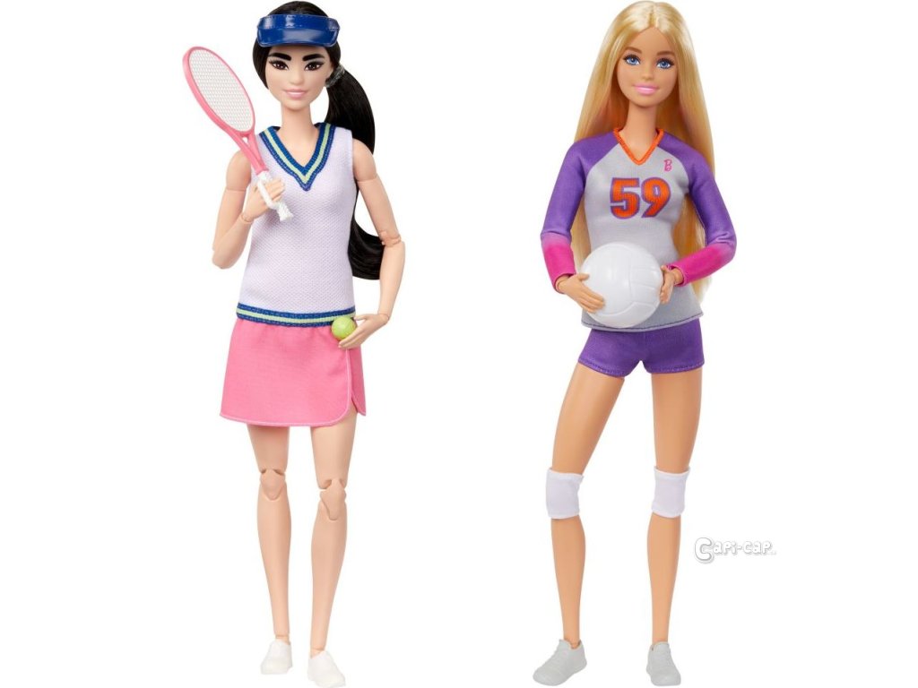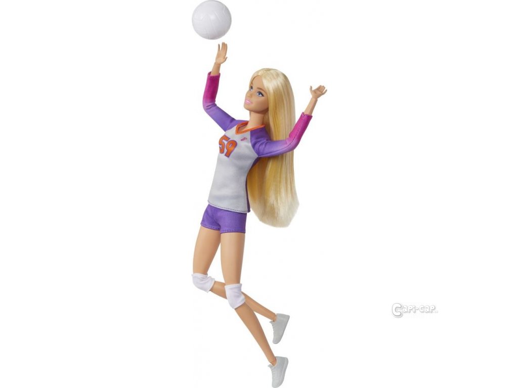 Panenka Barbie® Sportovkyně - volejbalistka je připravena na pořádnou smeč! Panenka má na sobě dres svého týmu, šortky, chrániče kolen a volejbalový míč.