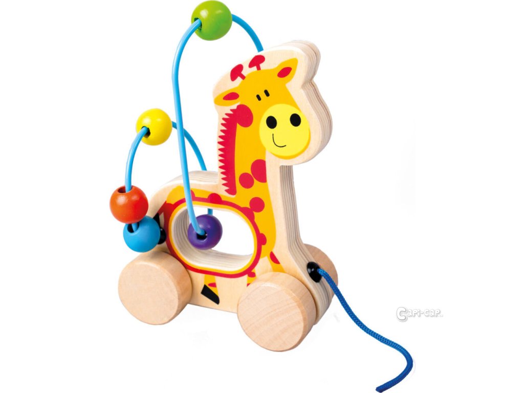 Tahací hračka s motivem žirafy, která pomáhá dětem s jejich prvními krůčky a cvičením rovnováhy. Posouvání barevných korálků je dobrým pomocníkem při procvičování jemné motoriky a koordinace pohybu.