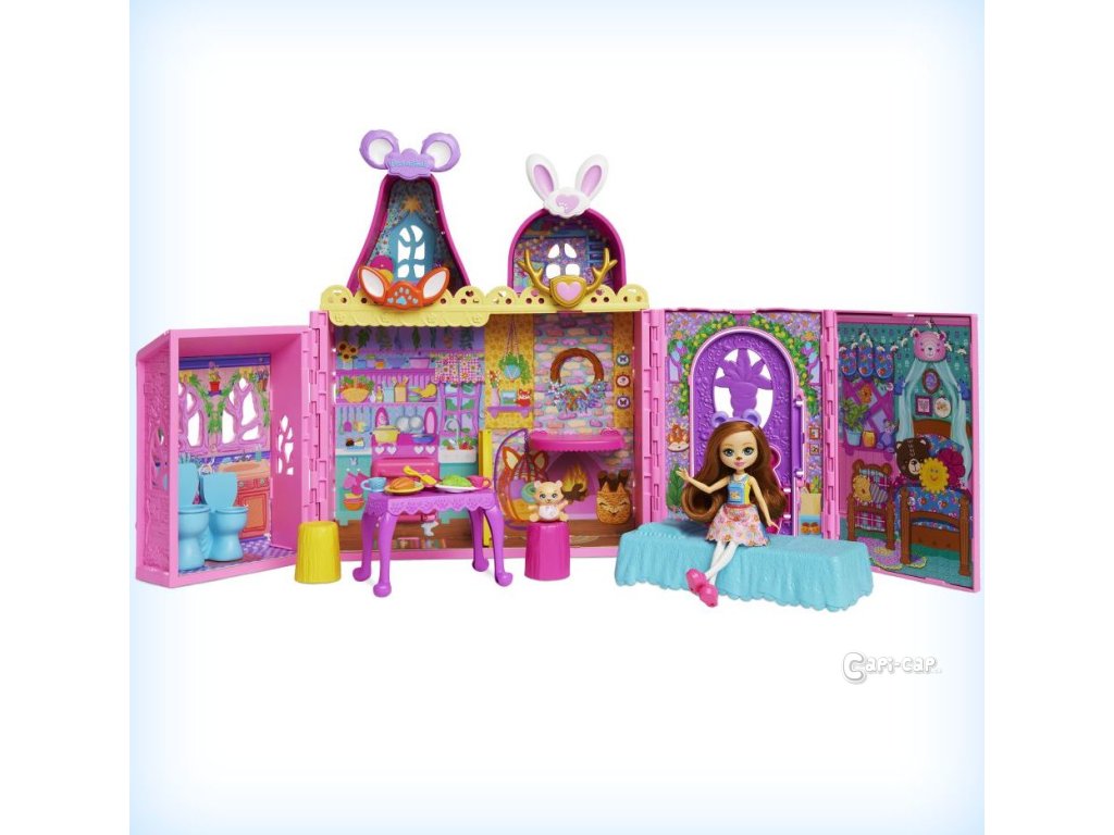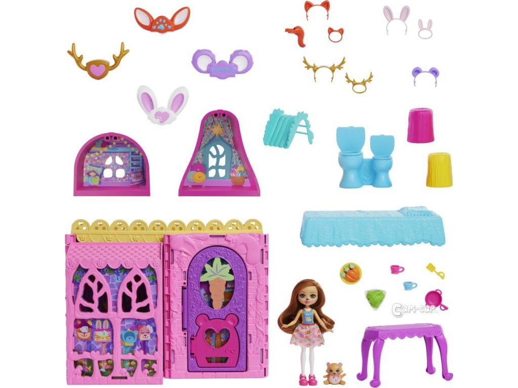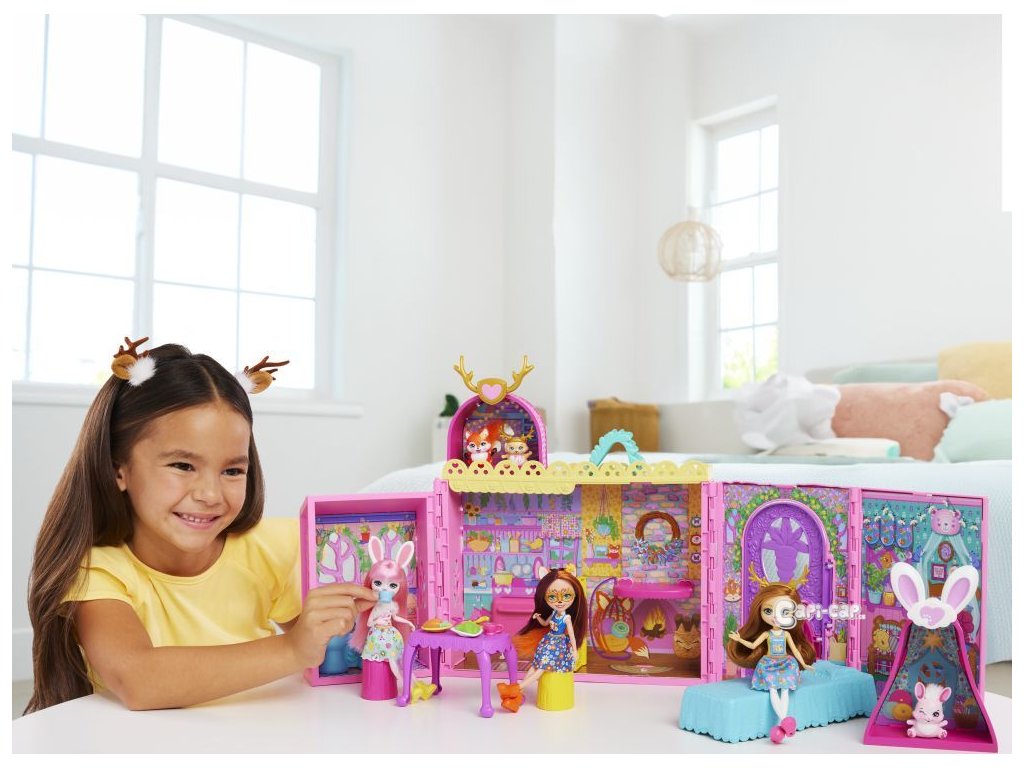 V Domečku přátelství Enchantimals™ je vítán každý! Přijďte si vyzkoušet proměňující se herní set, který umožňuje přizpůsobení hry pro panenky i nejlepší kamarády. Domeček se otevírá do sedmi hracích zón včetně kuchyně, koupelny, ložnice a dokonce i střešního bazénu! K dispozici je 24 doplňků, se kterými si děti mohou v domě přehrávat nespočet příběhů mezi panenkami a nejlepšími kamarády.