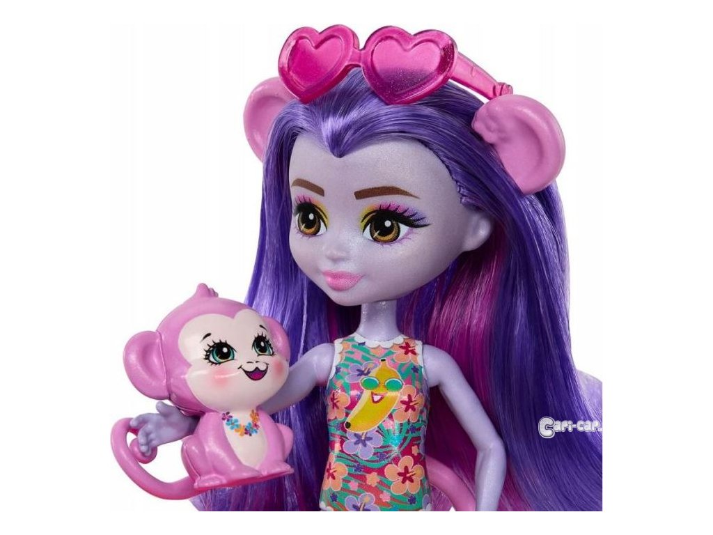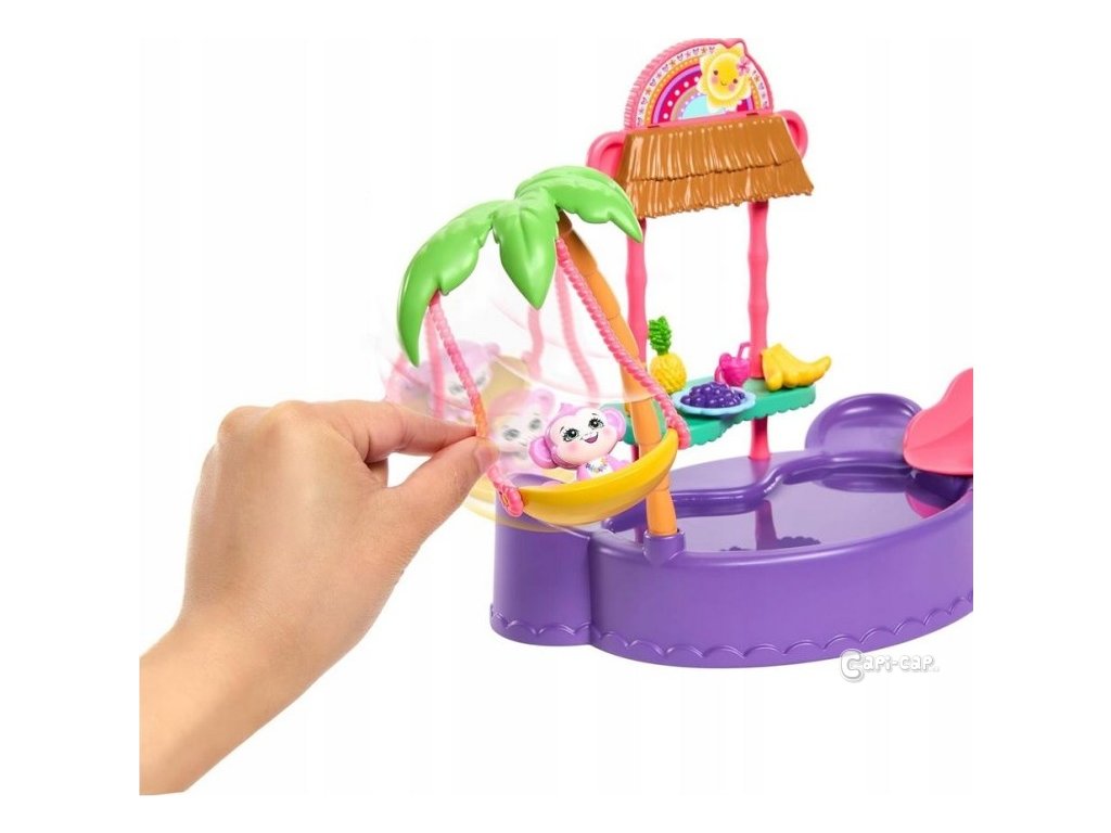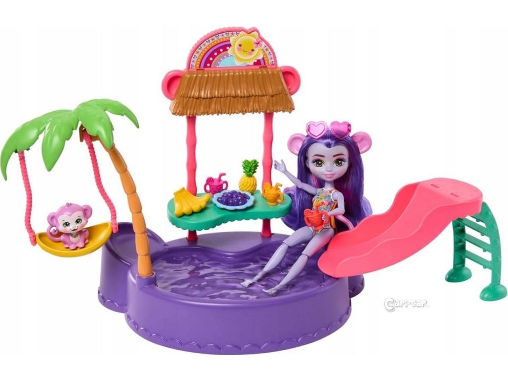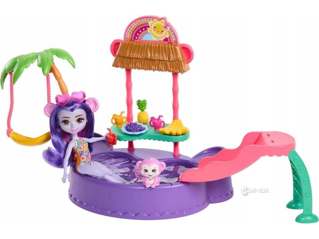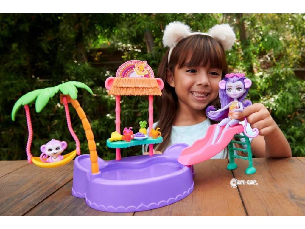 Na Sluneční pláži se koná obří párty u bazénu s Enchantimals™! Tento herní set s bazénem ve tvaru opice obsahuje panenku ve velikosti 15 cm s rozkošnými plavkami a slunečními brýlemi ve tvaru srdce a jejího nejlepšího zvířecího kamaráda. Sada obsahuje více než 12 herních dílků, a to včetně palmy s houpačkou, skluzavky u bazénu a stánku s džusem plného zdravého občerstvení! Děti si zamilují tento herní set, ve kterém mohou trávit čas u bazénu se svými oblíbenými postavičkami Enchantimals™!