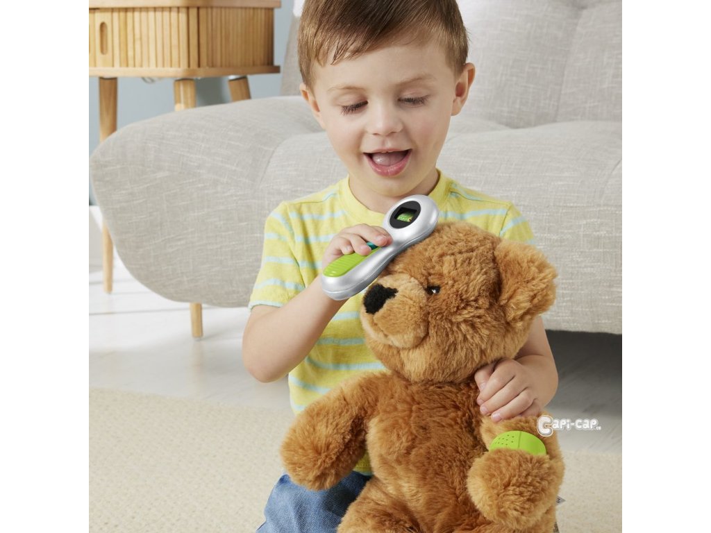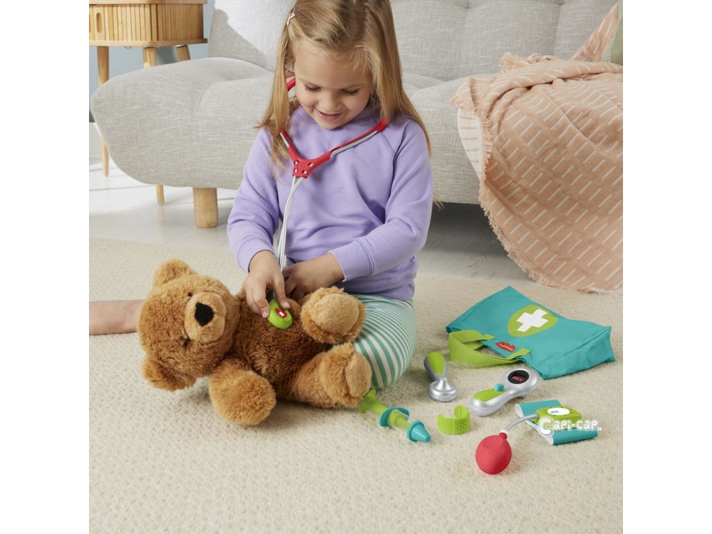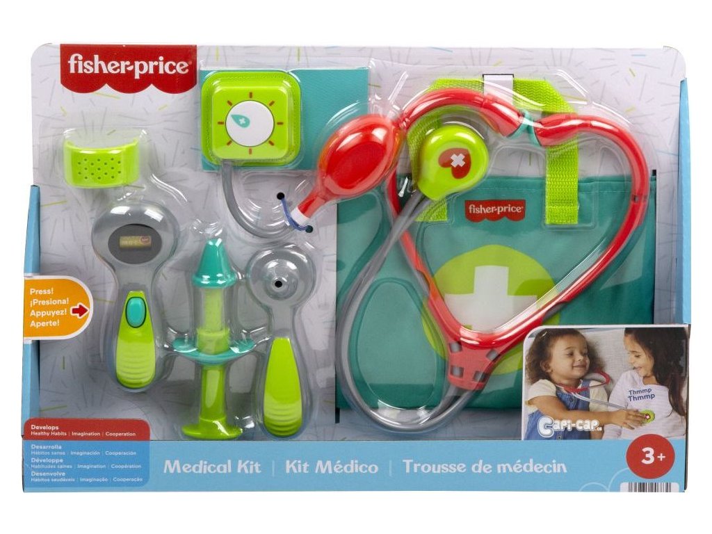 S doktorskou taškou Fisher-Price® mohou děti v předškolním věku léčit a ošetřovat pacienty v rámci nekončící hry na lékaře! Tento herní set obsahuje 7 hracích dílků s lékařskou tematikou, které mohou malí doktoři používat, včetně stetoskopu, teploměru, otoskopu, manžety na měření krevního tlaku s otáčecím tlakoměrem, injekční stříkačky a obvazové manžety pro ztvárnění bolístek.