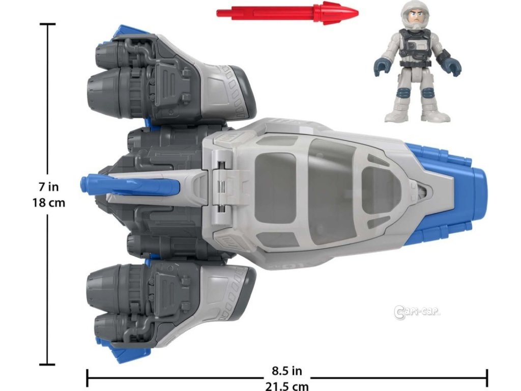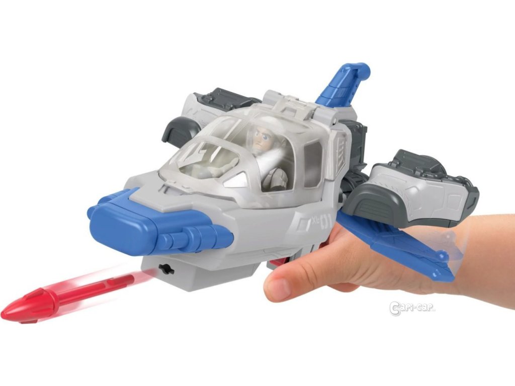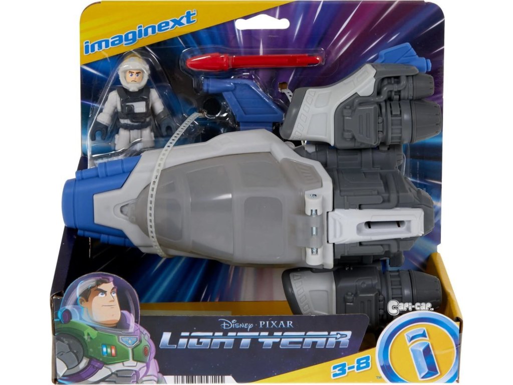Tento tryskáč od Imaginext®, stylizovaný jako první Buzzova vesmírná loď ve filmu, také vystřeluje projektily, když děti stisknou spoušť.