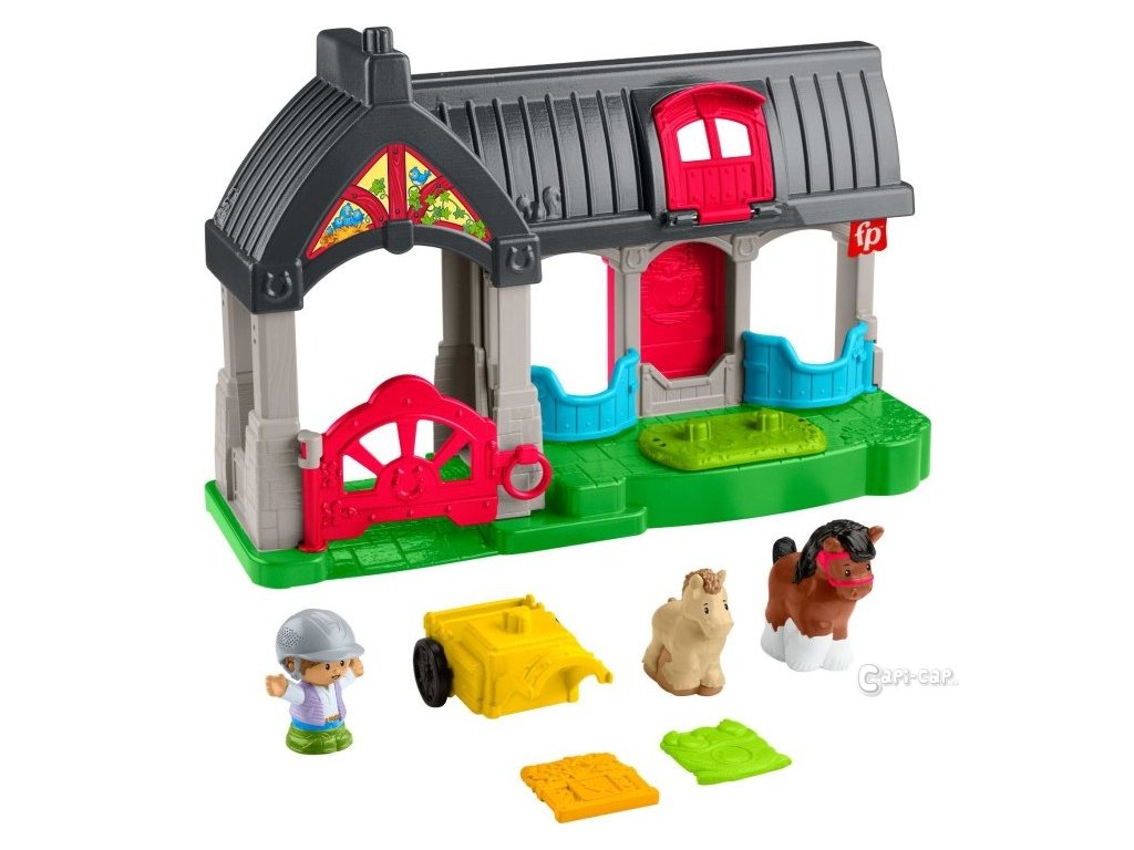 Koňské stáje obsahují vše, co je potřeba ve skutečné stáji – postavičku malého farmáře, pokoníky, krmení, seno a kolečko.