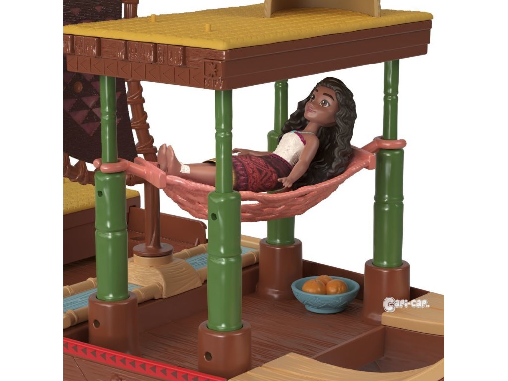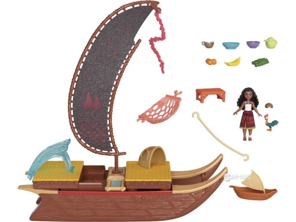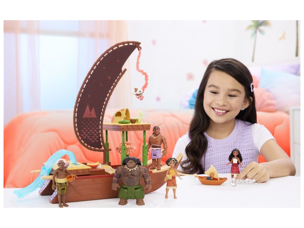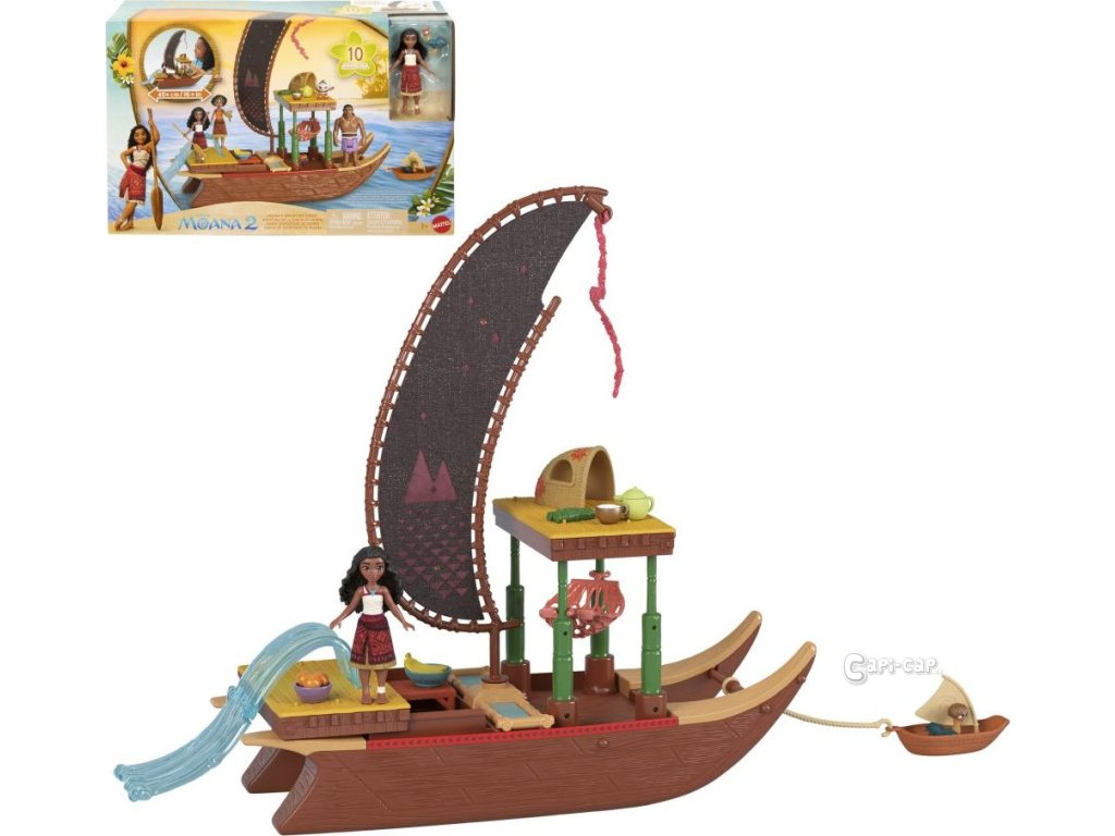 Inspirované Disneyho filmem Vaiana 2, který je pokračováním původního filmu, si děti dokážou představit dobrodružství se sadou Vaiana transformující se loď, která obsahuje malou panenku Vaiana a jejího přítele kohouta Heihei. Možnosti hraní jsou nekonečné díky 6 hracím prostorům: tobogán, kuchyň, houpací síť, plošina, bouda pro zvířata a loď pro zvířata Transformovatelné herní oblasti umocňují dobrodružství díky plošině, která se zvedne a odhalí houpací síť, plošině, která se posune a odhalí kuchyni, otevírací vodní skluzavku a otáčející se plachtu. Ruce, krk a nohy panenky Moana jsou kloubové pro ještě větší akci; Má na sobě oblečení inspirované filmem s odnímatelnou sukní a je 8 cm vysoká Tato plovoucí loď má délku více než 40 centimetrů a obsahuje 10 doplňků: 2 misky, 1 šálek, obal z cukrové třtiny, jídlo, stůl, houpací síť a malý člun pro Heihei. Děti od 3 let mohou sbírat všechny hračky Disney Vaiana 2 a představovat si nová dobrodružství v Motunui i jinde.