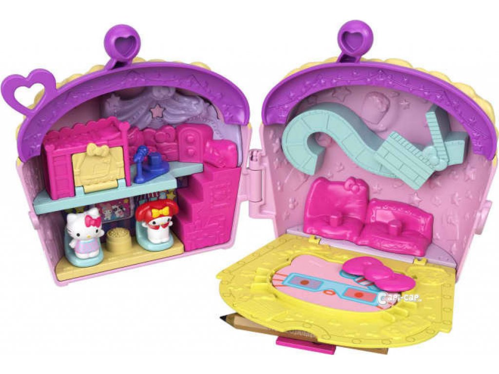 Sada obsahuje pouzdro s odnímatelným přívěskem na ruku, 2 figurky Sanrio Minis, 1 klíčenku s překvapením, 1 poznámkový blok a 1 tužku. Otevřete krabici a odkryjte herní sadu pro skvělou párty! K dispozici je otočný mikrofonní stojan, otočná TV, patrová postel pro 2, slot na poznámkový blok, úložný prostor a další.