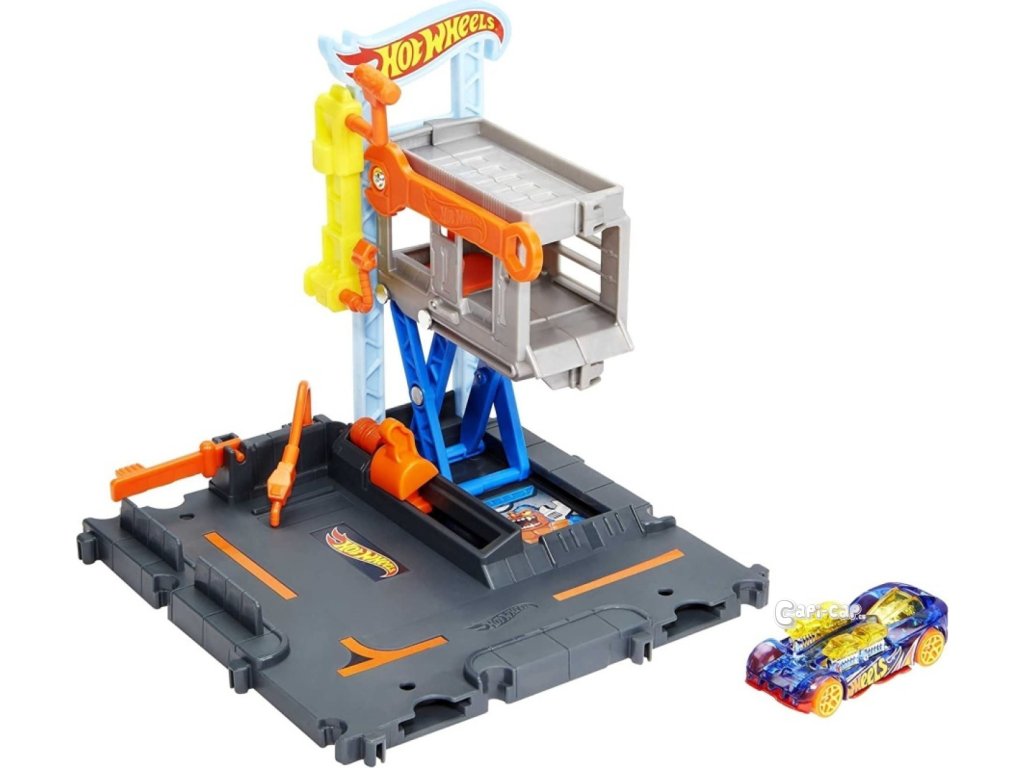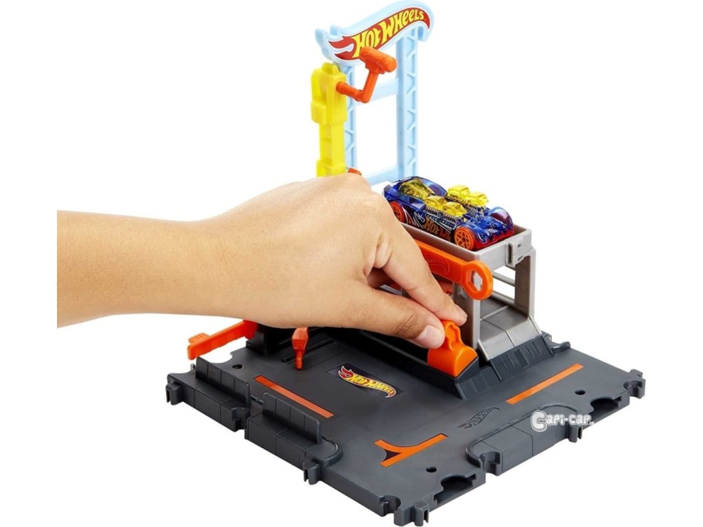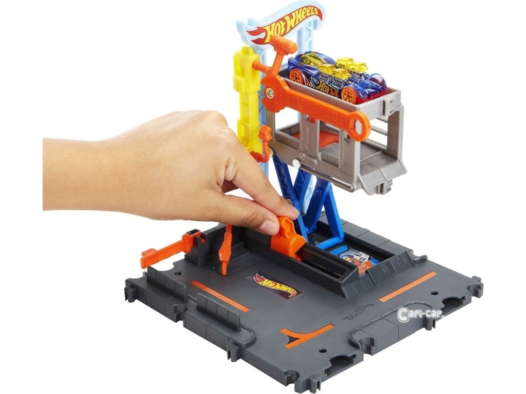 Autoservis v Hot Wheels™ City Centrum města je speciální vyladěný servis pro Hot Wheels™ City, který funguje úplně jako skutečný. Než vyrazíš na nová dobrodružství, nalož auto na výtah a zatáhni za páku, abys zkontroloval podvozek. Dodává se s jedním autem Hot Wheels® a je možné ho napojit k dalším setům.