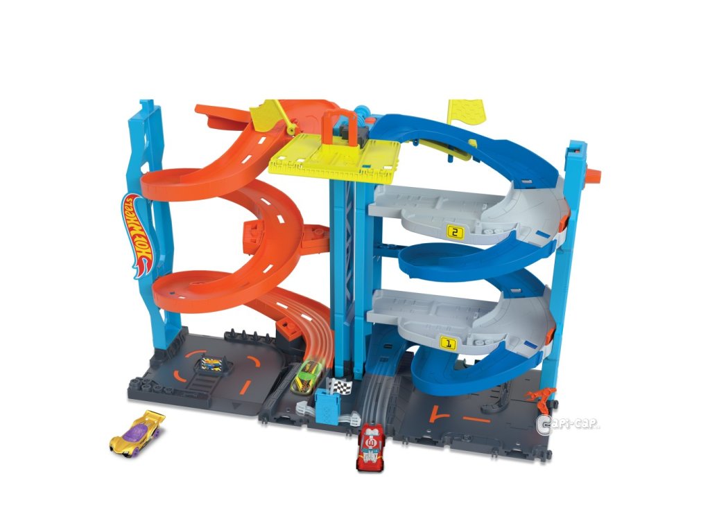 Vydejte se na epické závody v Hot Wheels™ City Závodní věži. Inovativní herní set se transformuje z vedle sebe umístěných závodních drah s brankami pro spravedlivý start na jedinou dráhu, která je více než 66 cm vysoká. Součástí je 1 vozidlo Hot Wheels® a spousta herních prvků pro posouvání na základně, které podporují samostatnou hru.