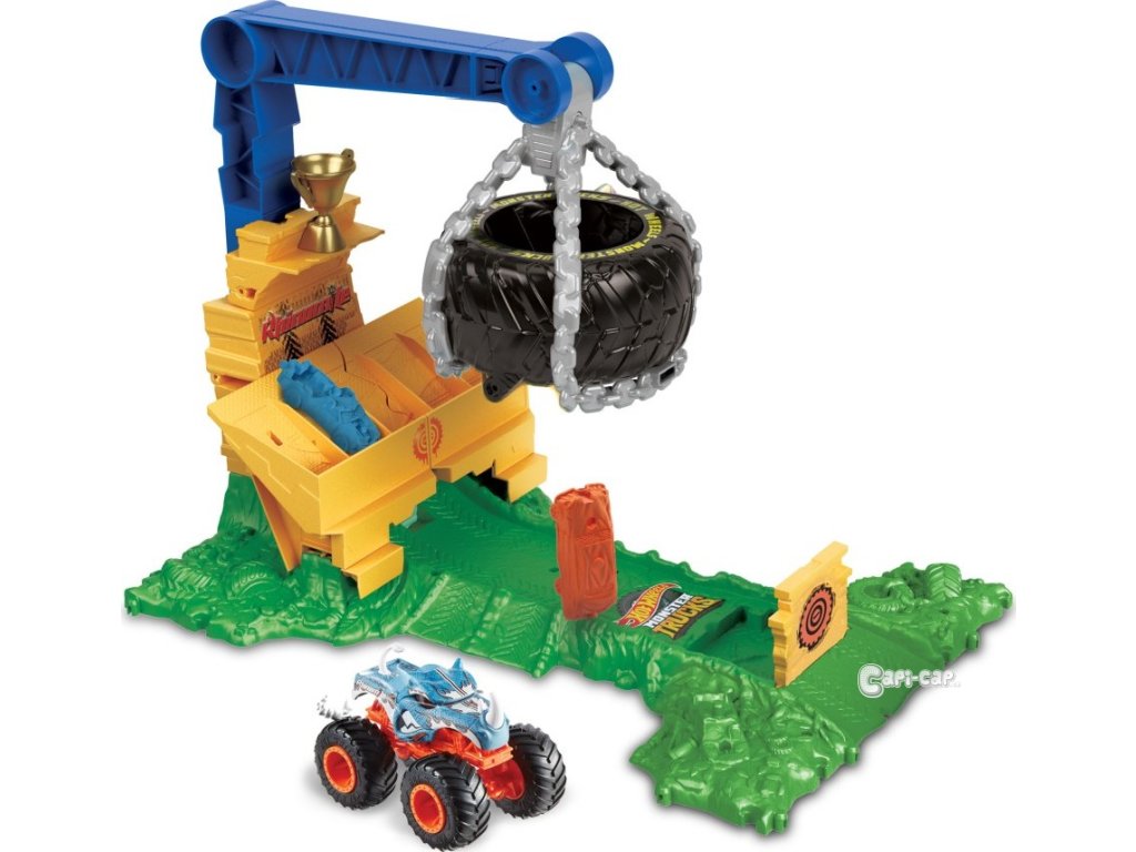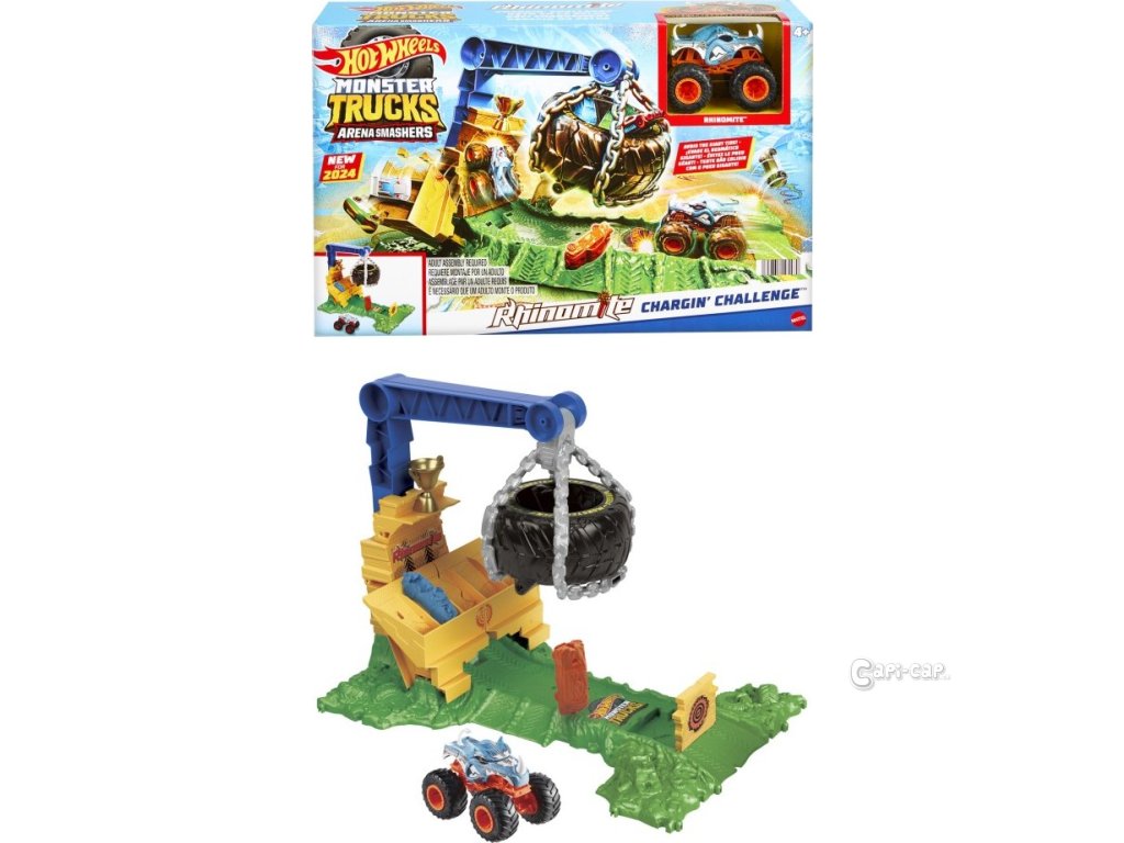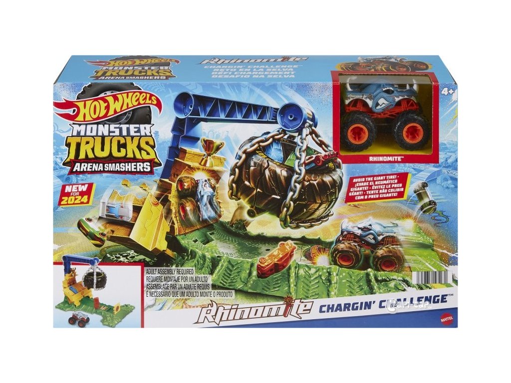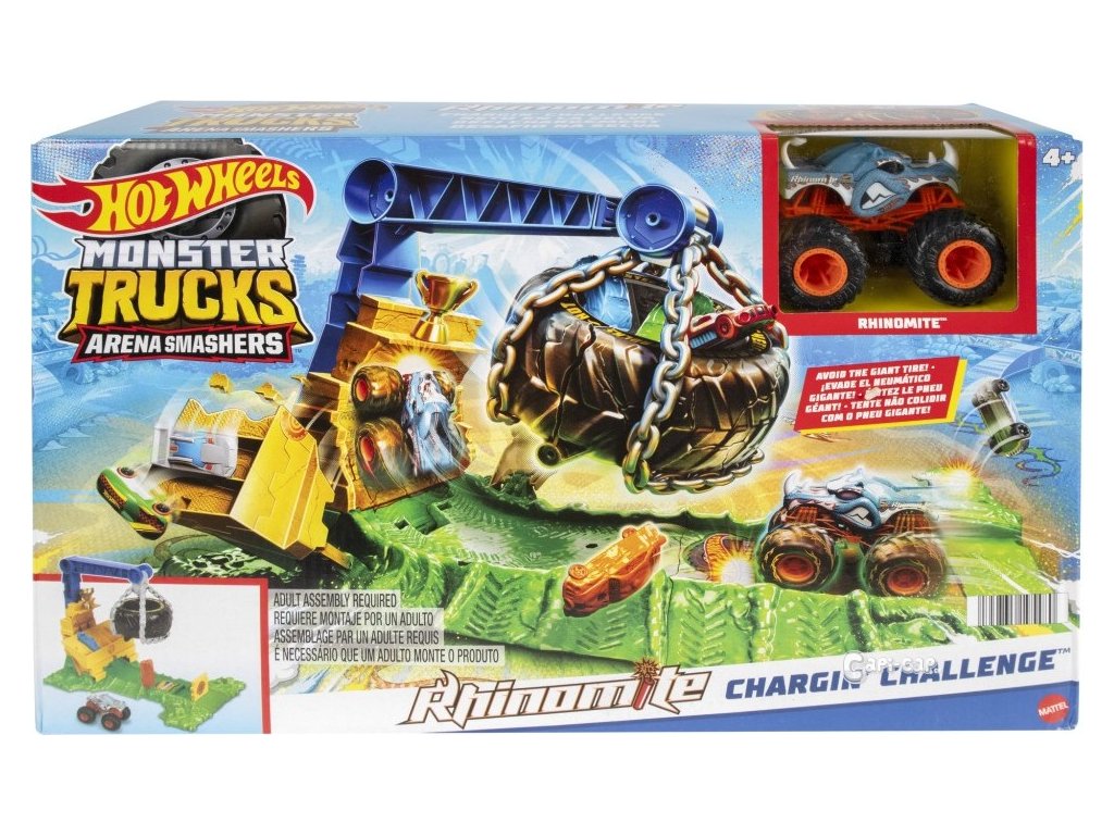 V setu Hot Wheels® Monster Trucks Aréna: Výzva pro Rhinomita mohou děti s přiloženým Monster Truckem Rhinomite prorážet rozebíratelné stěny a získat tak trofej pro vítěze. Dávejte si pozor: nenechte se rozbít obří pneumatikou, která se vznáší nad vámi! Barvy a provedení se mohou lišit.