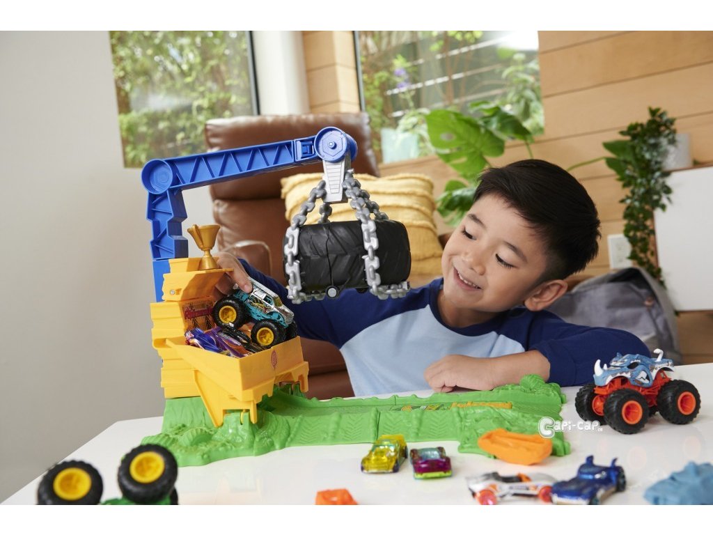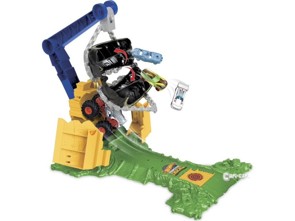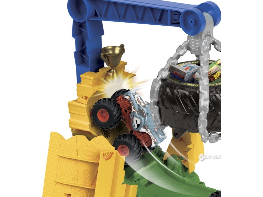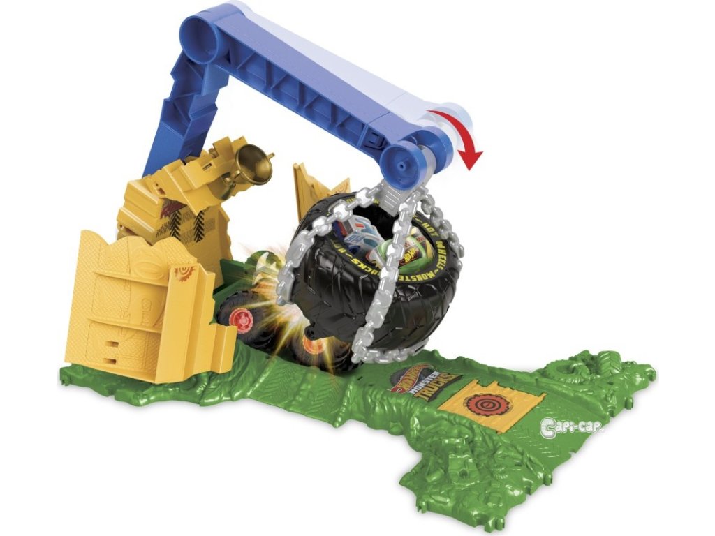V setu Hot Wheels® Monster Trucks Aréna: Výzva pro Rhinomita mohou děti s přiloženým Monster Truckem Rhinomite prorážet rozebíratelné stěny a získat tak trofej pro vítěze. Dávejte si pozor: nenechte se rozbít obří pneumatikou, která se vznáší nad vámi! Barvy a provedení se mohou lišit.
