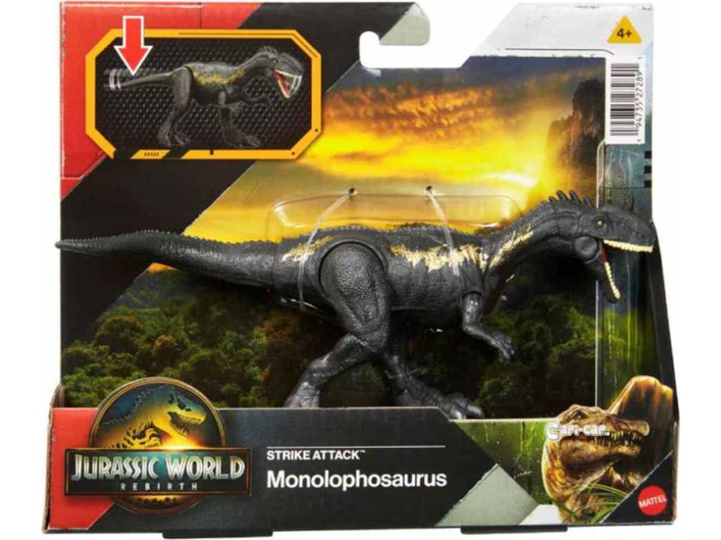 Tyto akční figurky dinosaurů z Jurského světa Dinosaurus útočí mají jeden úderný prvek, který demonstruje největší sílu každého druhu, pohyblivé klouby, realistické zpracování a autentické zdobení, a měří přibližně 10 až 13 cm na výšku a 18 až 20 cm na délku. Rozšířená digitální hra je k dispozici po naskenování jejich DNA tagu ve vylepšené aplikaci Jurassic World Facts.