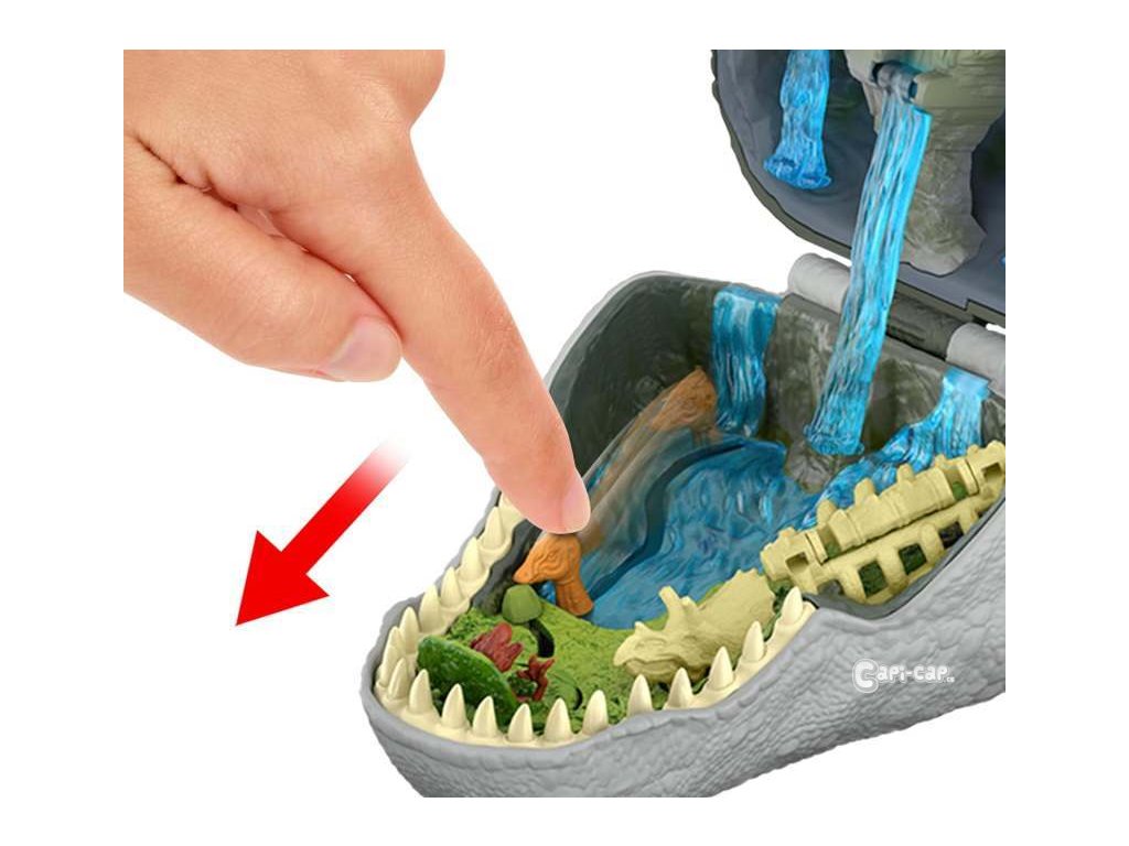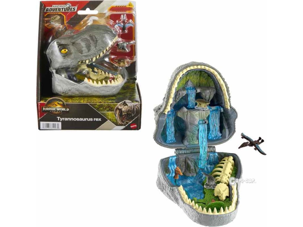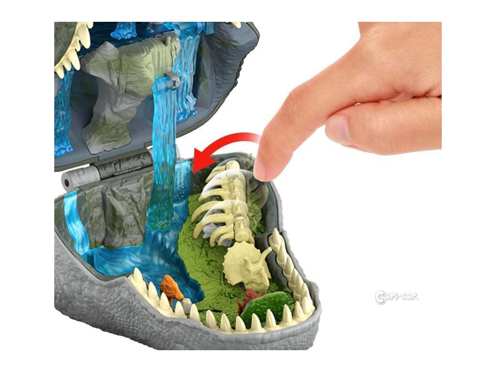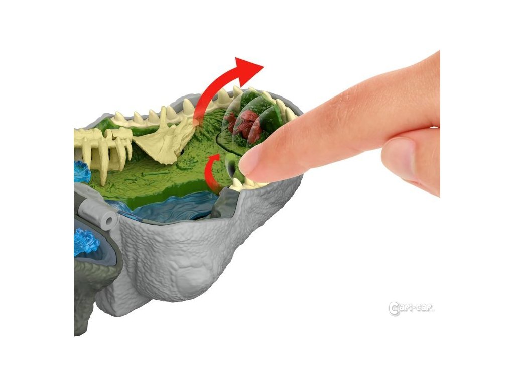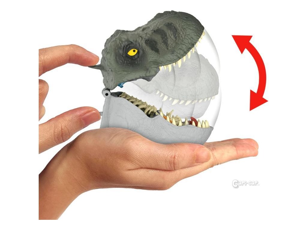 Dinosauří hlava T. Rexe z Jurského světa: Znovuzrození je přenosná dinosauří hlava s tlamou plnou ostrých zubů! Mikro dobrodružství! Čtyři prvky prostředí inspirované filmovým prostředím jsou rozmístěny po celé herní sadě s T. rexem a aktivují se prsty; součástí jsou 3 mikrofigurky pro záživnější vyprávění. Neomezená zábava! S tolika funkcemi, které lze aktivovat, je sada připravena ke hraní (žraní) inspirované Jurským světem Znovuzrození. A když je složena, poutko na zadní straně hlavy T-rexe aktivuje zábavu s dinosauřím žvýkáním! Snadno se sbalí na cesty po městě nebo napříč zemí, nebo se dá úhledně uskladnit doma! Tři figurky bezpečně padnou na kolíky rozmístěné po celé sadě a sada se dá složit až na délku cca 11 cm. Skvělý dárek! Tato hrací hlava Tyrannosaura Rexe je skvělým dárkem pro milovníky dinosaurů, zejména pro fanoušky Jurského světa, kteří si rádi hrají hned po vybalení!