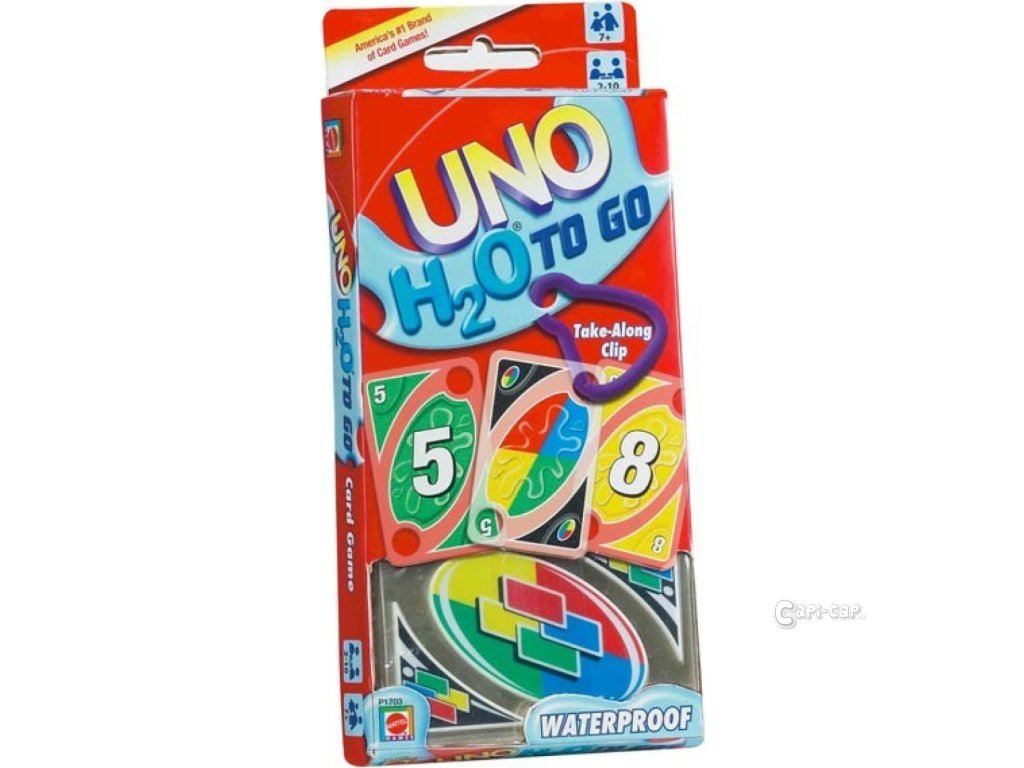 Nová verze karet UNO H2O! Kartičky jsou plastové, takže odolají nejen vodě, ale i nečistotám! Navíc obsahují klip, na který můžeš připnout všechny karty a nehrozí tak jejich ztráta! Vem si tyto cestovní UNO karty kamkoliv s sebou! Věk 7+.