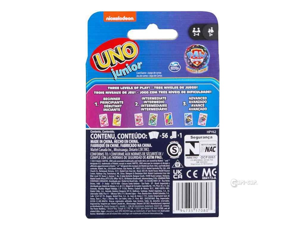 Milovníci UNO® Junior a filmu Tlapková patrola ve velkofilmu si zamilují tuto karetní hru, která obsahuje grafiku inspirovanou oblíbenými postavami a scénami z filmu. Hra nabízí tři úrovně – začátečník, střední a pokročilý – takže mladší hráči mohou růst ve svých herních dovednostech. A když vám zůstane poslední karta, nezapomeňte křičet "UNO!" Skvělý dárek pro fanoušky Tlapkové patroly a milovníky karetních her od 3 let. Barvy a vzhled karet se mohou lišit.