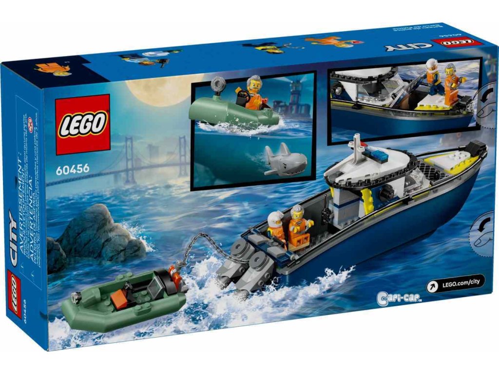 Malí hrdinové si přímo zamilují stavebnici LEGO® City (60456) Honička v policejní lodi. Tato stavebnice je ideální pro stavitele od 6 let a obsahuje policejní loď se dvěma závěsnými motory a vězeňskou celou na palubě a k tomu motorový člun. Obě lodě plují po vodě a děti se s nimi můžou vydat na napínané policejní honičky se 2 policisty, zločincem, rychlým žralokem a ukradeným rubínem! Součástí této stavebnice LEGO City je podrobný tištěný návod na stavění a digitální pokyny v aplikaci LEGO Builder, což je digitální průvodce stavěním s intuitivními nástroji přibližování a otáčení. Umožní jim prohlížet si modely ze všech úhlů, zatímco na nich pracují. Tvoje město, tvoje pravidla! Se stavebnicemi LEGO City se děti vydají na akční stavitelská a herní dobrodružství plná tvořivé zábavy. Zkombinujte tuto policejní stavebnici LEGO k dalším (prodávají se samostatně) z řady LEGO City a zažijte ještě více dobrodružství! Stavebnice obsahuje 264 dílků.