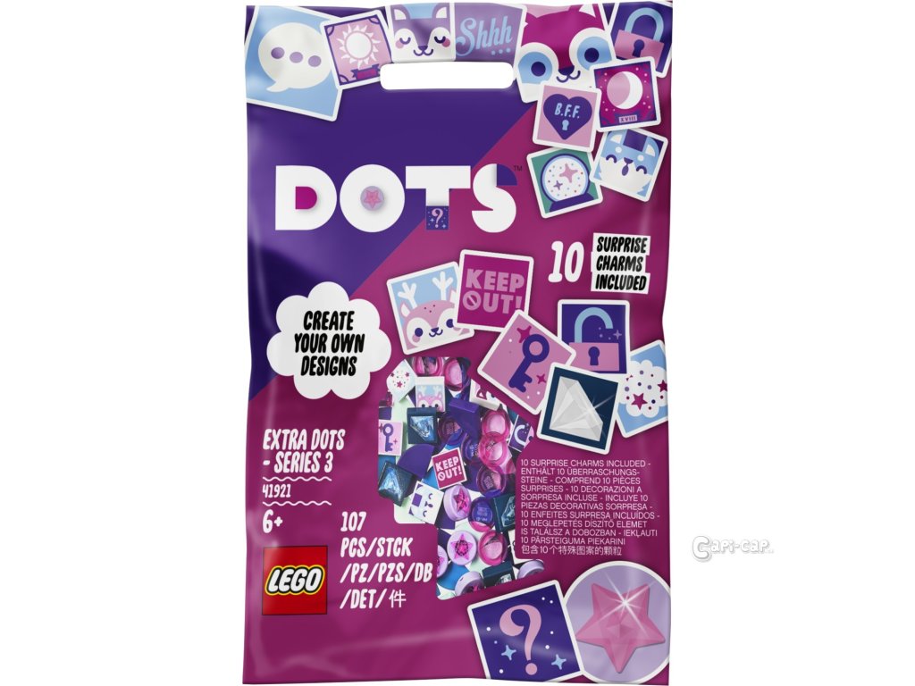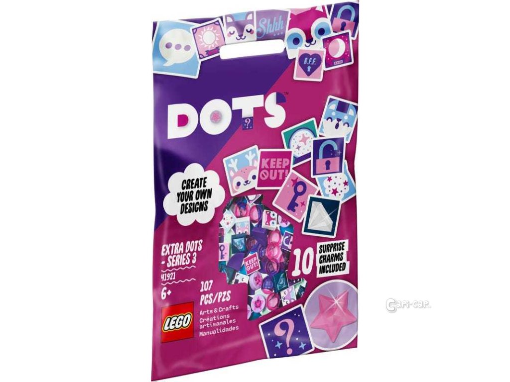• Dajte kreatívnym nadšencom do tvorenia vlastných šperkov možnosť originálne si ozdobiť svoje výtvory pomocou dielikov zo sady DOTS doplnky – 3. séria (41921). Čo presne v sáčku nájdu, je tak trochu tajomstvom! • Zaúkolujte detskú predstavivosť a kreativitu pomocou 81 zberateľských zdobítok v 4 farbách. Nechýba ani 16 dielikov so špeciálnymi 3D hviezdičkami a diamantmi a ďalšie prekvapenia. • Dieliky sa skvele hodia na zdobenie náramkov i bytových doplnkov. Deti môžu zdobítka použiť v kombinácii s ďalšími DOTS sadami alebo ktorýmikoľvek LEGO® stavebnicami. • Otvorenie sáčku s DOTS doplnkami z 3. série (41921) urobí radosť všetkým kreatívnym dušiam. Nové farby a špeciálne zdobidlá sa môžu vždy hodiť. Zároveň ide o skvelý darček pre dievčatá aj chlapcov od 6 rokov. • Darujte deťom možnosť tvoriť vlastné designy s LEGO® DOTS. Toto vrecko s farebnými a originálnymi zdobítkami im pomôže získať pri tvorení dôveru vo vlastnú kreativitu. • LEGO® DOTS ponúkajú otvorené a kreatívne hranie a nabádajú deti k tomu, aby sa prejavili tvorbou a zdobením vlastných šperkov alebo bytových doplnkov. Zábava a LEGO hranie sa tak dostáva do rúk aj tým, ktorí sa napríklad s týmito hračkami zatiaľ nestretli. • Už od roku 1958 spĺňajú LEGO® dieliky striktné normy, aby boli konzistentné, kompatibilné a umožňovali spoľahlivé spájanie a rozoberanie. • LEGO® dieliky púšťame na zem, zahrievame, drvíme, krútime a analyzujeme, aby sme zaistili, že spĺňajú prísne globálne bezpečnostné štandardy.