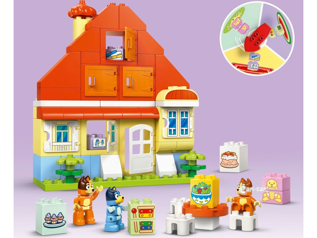 Sestavitelný domeček inspirovaný televizním seriálem Bluey – Tento barevný model rodinného domu Heelerových se pyšní pokoji s otevíracími okny, zábavným kolečkem s otočnou ručičkou, stolem a 3 židlemi