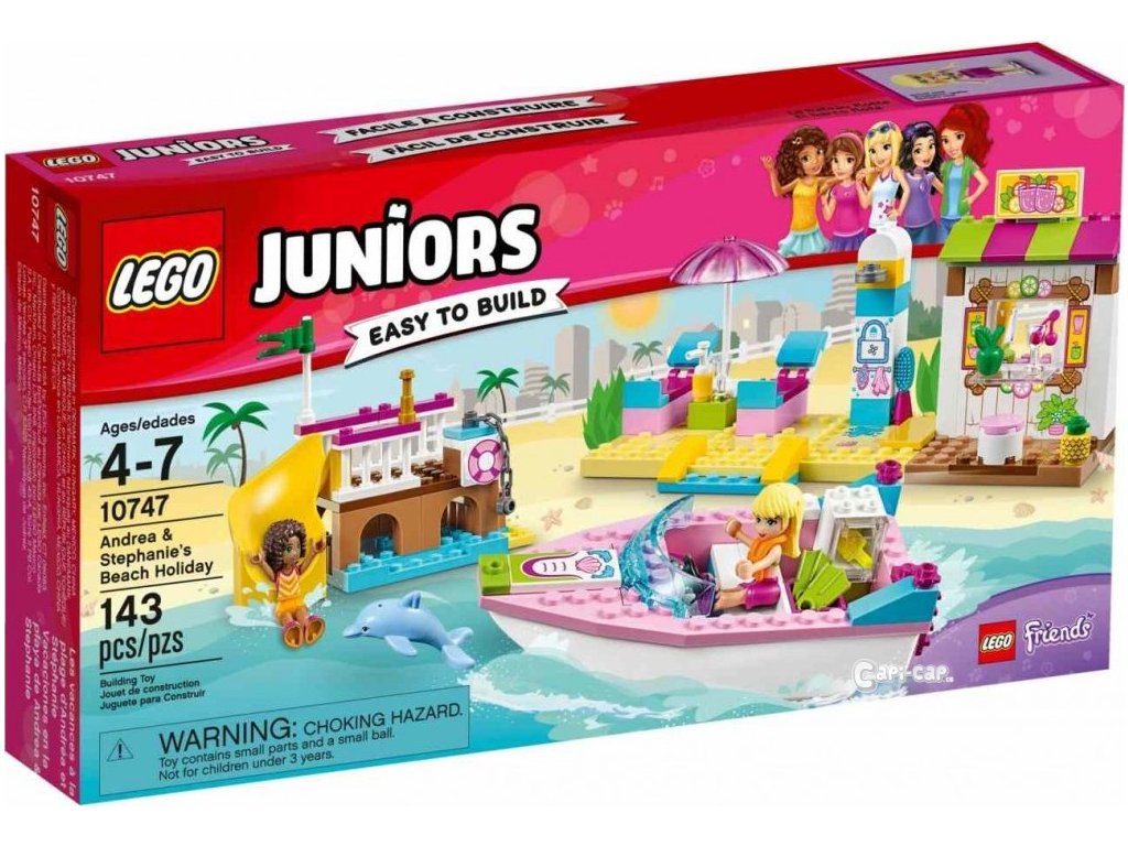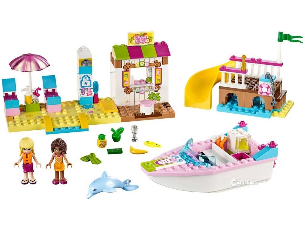 Keď svieti slniečko, je čas, aby sa Stephanie a Andrea začali hrať! Vydaj sa na LEGO Friends pláž a uži si zábavu na šmykľavke v prístave alebo doplávaj k rýchlemu motorovému člnu a kúp sa v mori spoločne s roztomilým delfínom. Vďaka všetkej tej zábave dostanú kamarátky smäd, a tak sa vydávajú späť na pobrežie, kde si vezmú chladený nápoj predtým, než si oddýchnu na ležadlách - hlavne sa nezabudni natrieť opaľovacím krémom!