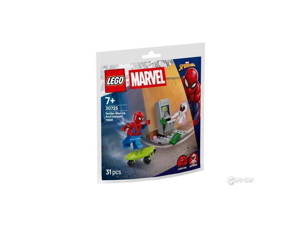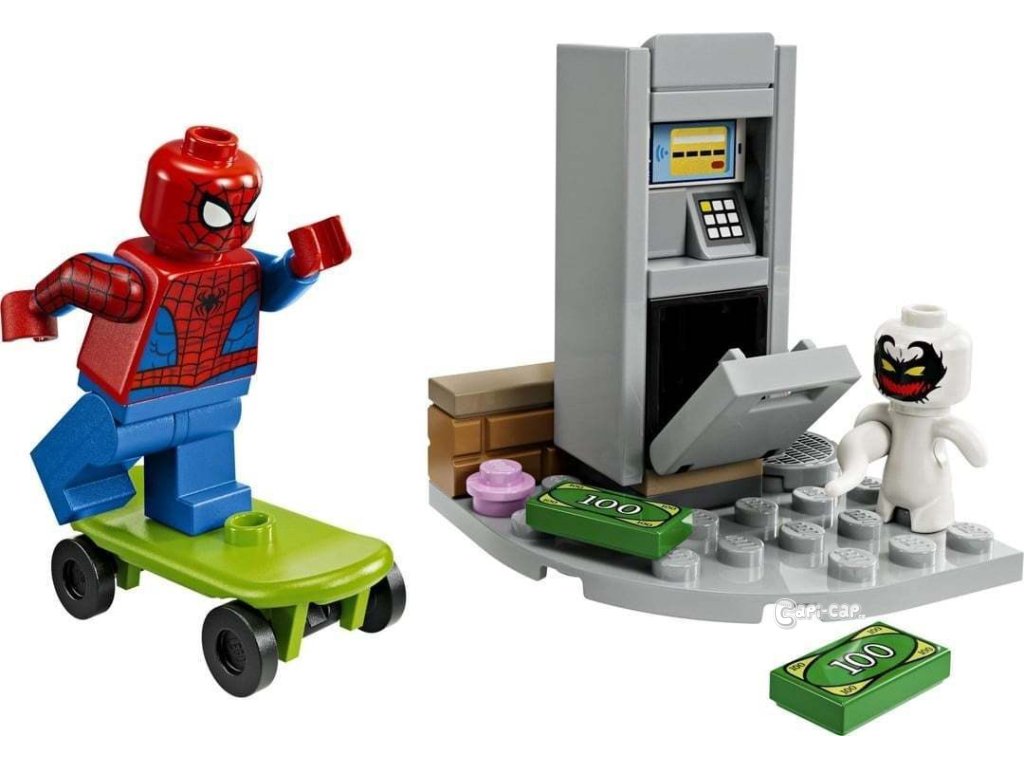 Dohoní Spider-Man na svém skateboardu Anit-Venoma, který se vloupal do bankomatu a odcizil z něj všechny bankovky ? Sběratelský sáček Lego.