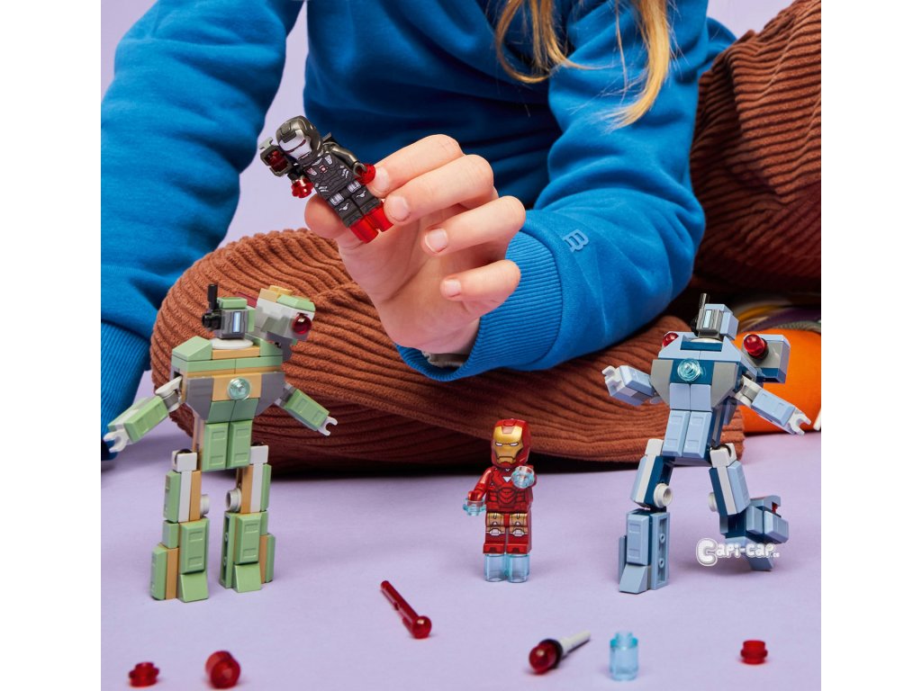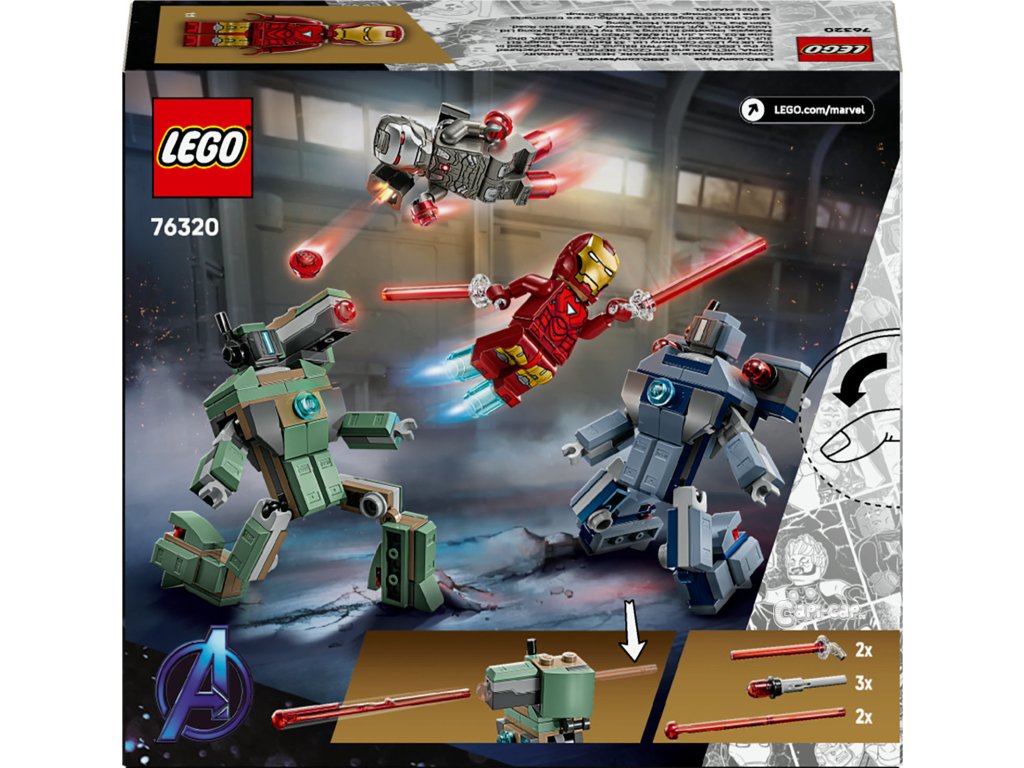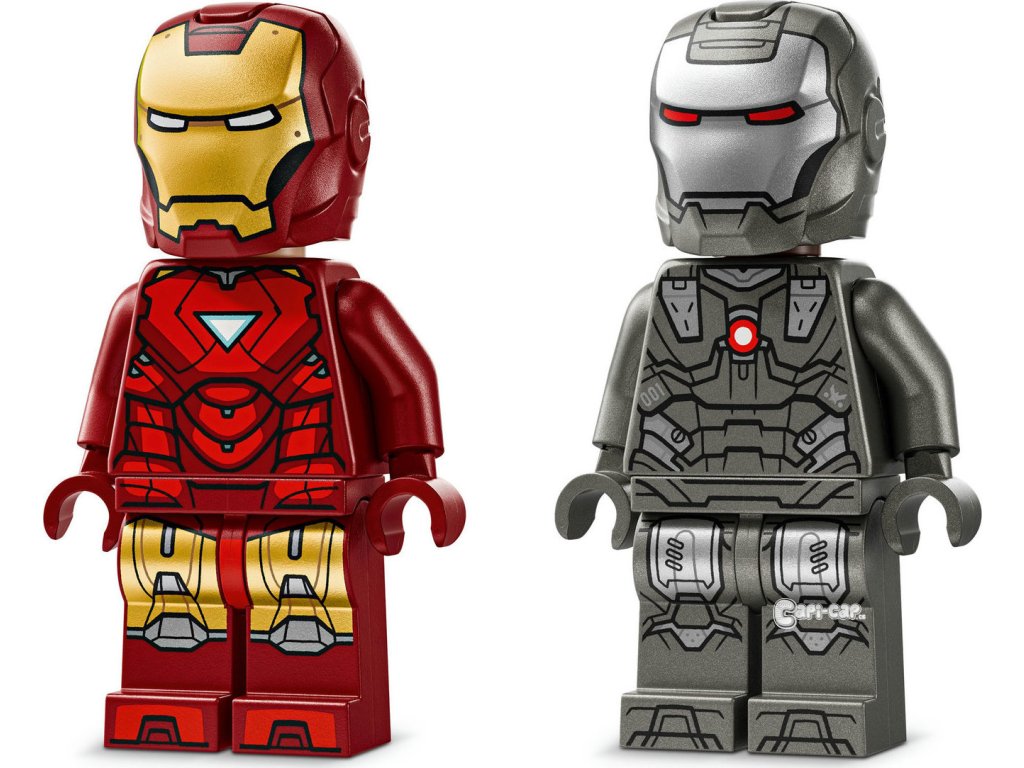 Minifigurky LEGO® ǀ Marvel – Součástí je minifigurka Iron Mana s modrými blastery na rukou a nohou a laserovými zbraněmi a minifigurku War Machine s červenými blastery na rukou a nohou a vystřelovačem
