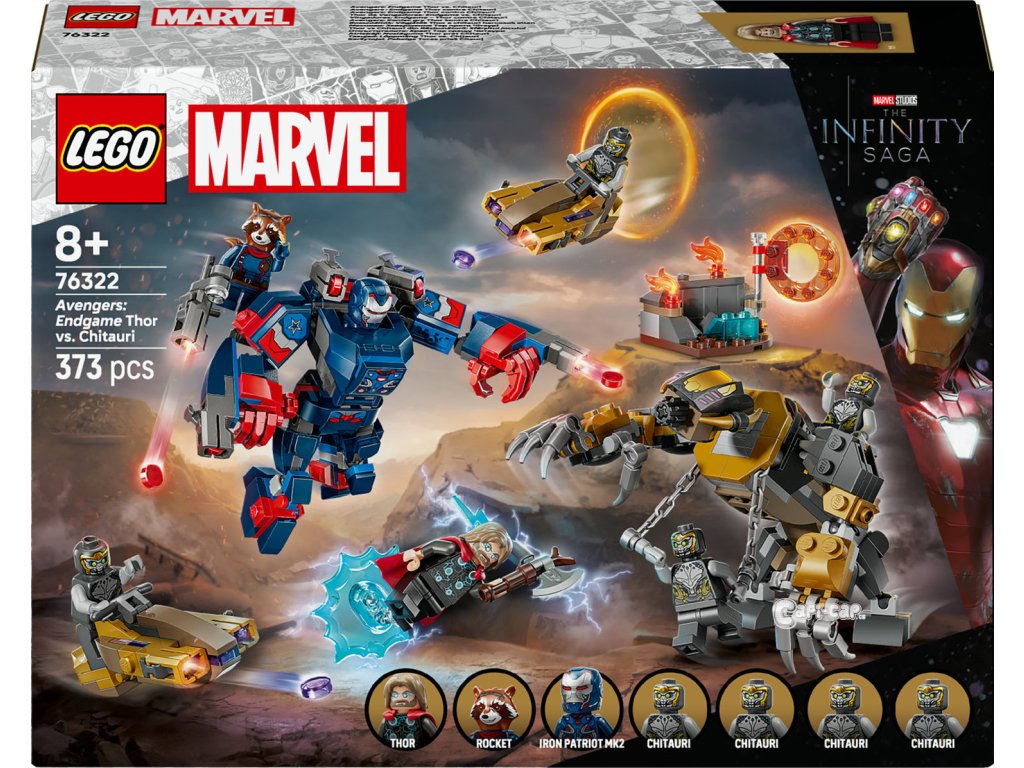 Minifigurky LEGO® ǀ Marvel – Součástí je 7 minifigurek: Iron Patriot MK2, Rocket s velkým vystřelovačem, Thor se Stormbreakerem a 4 Chitauri, z nichž 2 mají zlaté vystřelovače