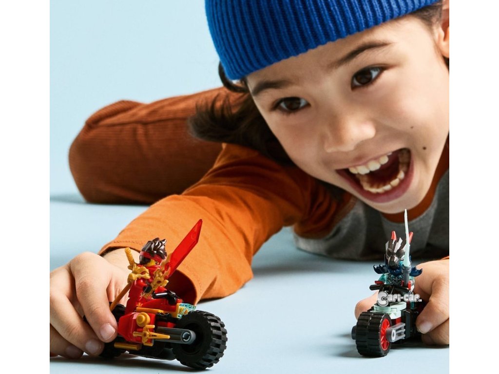 Se stavebnicí Kai a závody na motorkách (71838) si kluci a holky od 6 let připomenou akční scény z 3. řady televizního seriálu NINJAGO® Dračí povstání. Tato akcí nabitá stavebnice obsahuje 2 nindžovské motorky s pohyblivými koly: Kaiovu závodní motorku ozdobenou 2 dýkami a démonickou motorku Přízračného dračího zvěda. Tato nindžovská stavebnice obsahuje 2 minifigurky NINJAGO, které můžou řídit motorky: Kaie vyzbrojeného průsvitnou odhalující čepelí a 2 zlatými katanami a Přízračného dračího zvěda s mečem. Děti si s touto stavebnicí užijí hodiny kreativního hraní na bitvy dobra proti zlu, ať už sólo nebo s kamarády. V dalších stavebnicích z řady LEGO® NINJAGO se sestavitelnými hračkami s nindžovskou tematikou najdete draky, vozidla a chrámy a fanoušci si užijí hodiny zábavného hraní se svými oblíbenými hrdiny. Aplikace LEGO Builder vám a vašemu dítěti ukáže snadnou a intuitivní cestu stavitelským dobrodružstvím pro skládání nindžovského modelu. Stavebnice obsahuje 79 dílků.
