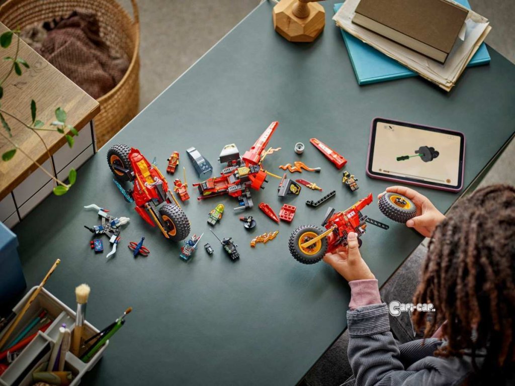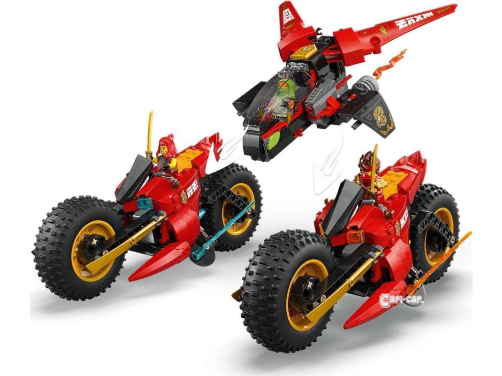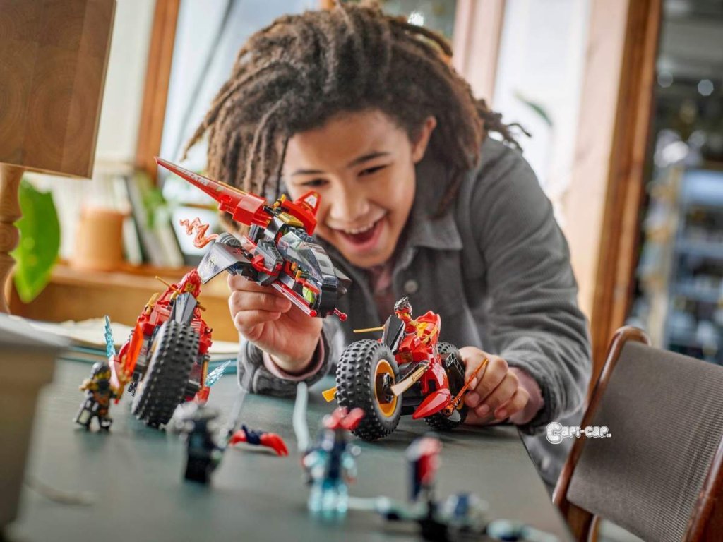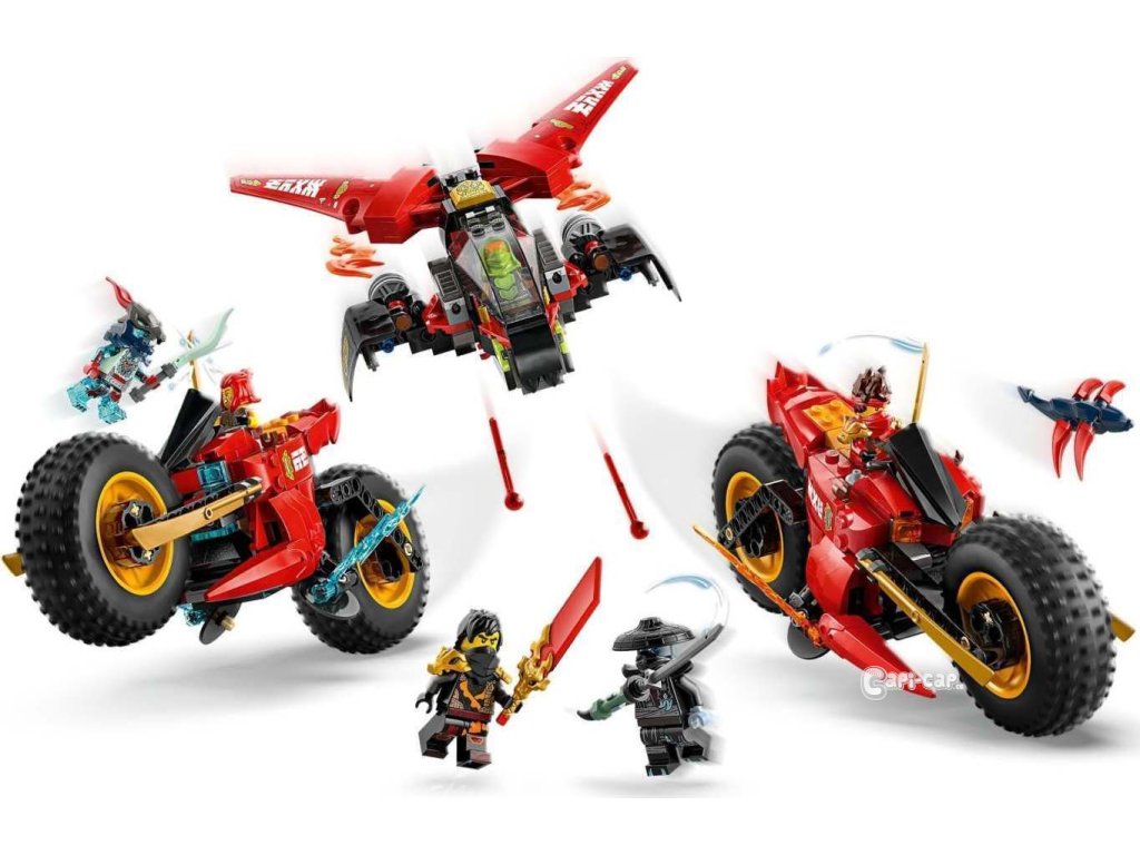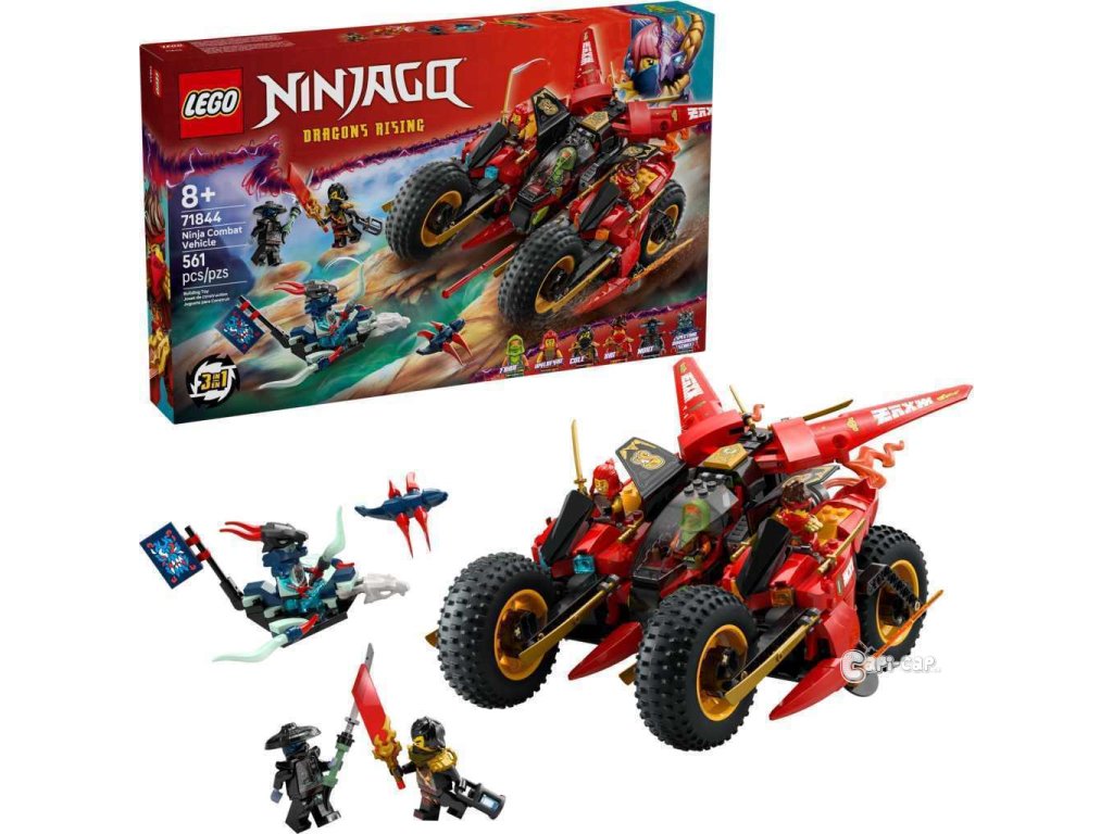 Děti od 8 let si se stavebnicí Bojového vozidla 3 v 1 (71844) připomenou scény z 3. řady televizního seriálu NINJAGO® Dračí povstání. Děti si můžou hrát s velkou akční figurkou nindžovské motorky a pak ji rozdělit na 3 menší vozidla: Kaiovu motorku, Wyldfyreinu motorku a Frakovu stíhačku se 2 vystřelovači. Tato stavebnice LEGO® obsahuje 6 minifigurek: Kaie, Wyldfyre a poprvé i Fraka, z nichž každá má 2 zlaté katany, Colea s průsvitnou odhalující čepelí a Nokta a Přízračného dračího zvěda, z nichž má každý jeden meč, a k tomu navíc model kluzáku a malého tvora. Zlotřilá dvojice má také vlajku s tajnou zprávou, kterou dokáže odhalit pouze Coleova průsvitná odhalující čepel. V dalších stavebnicích z řady LEGO NINJAGO najdete draky, vozidla a chrámy a fanoušci si užijí hodiny zábavného hraní se svými oblíbenými hrdiny. Aplikace LEGO Builder vám a vašemu dítěti ukáže cestu stavitelským dobrodružstvím pro skládání nindžovského modelu. Stavebnice obsahuje 561 dílků.