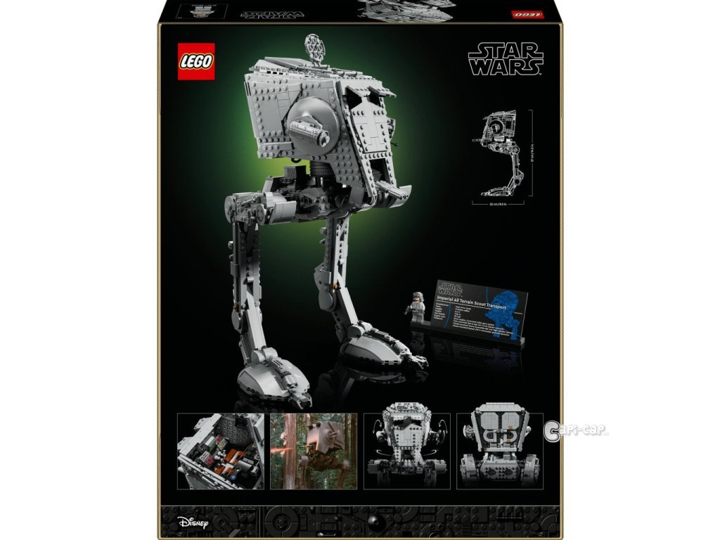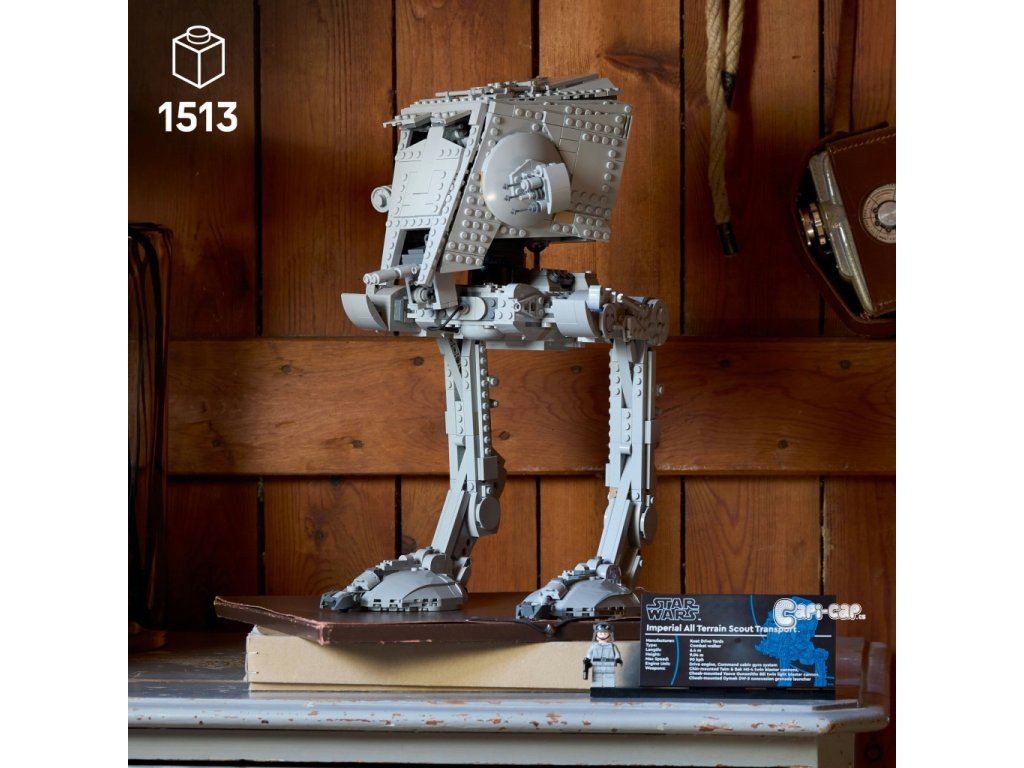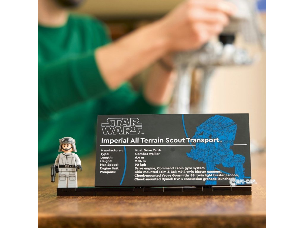 Výstavní model – Vystavte si svůj výtvor vedle cedulky s informacemi o AT-ST a unikátní minifigurky LEGO® řidiče AT-ST Star Wars™ s erbem Impéria na pažích a blasterovou pistolí