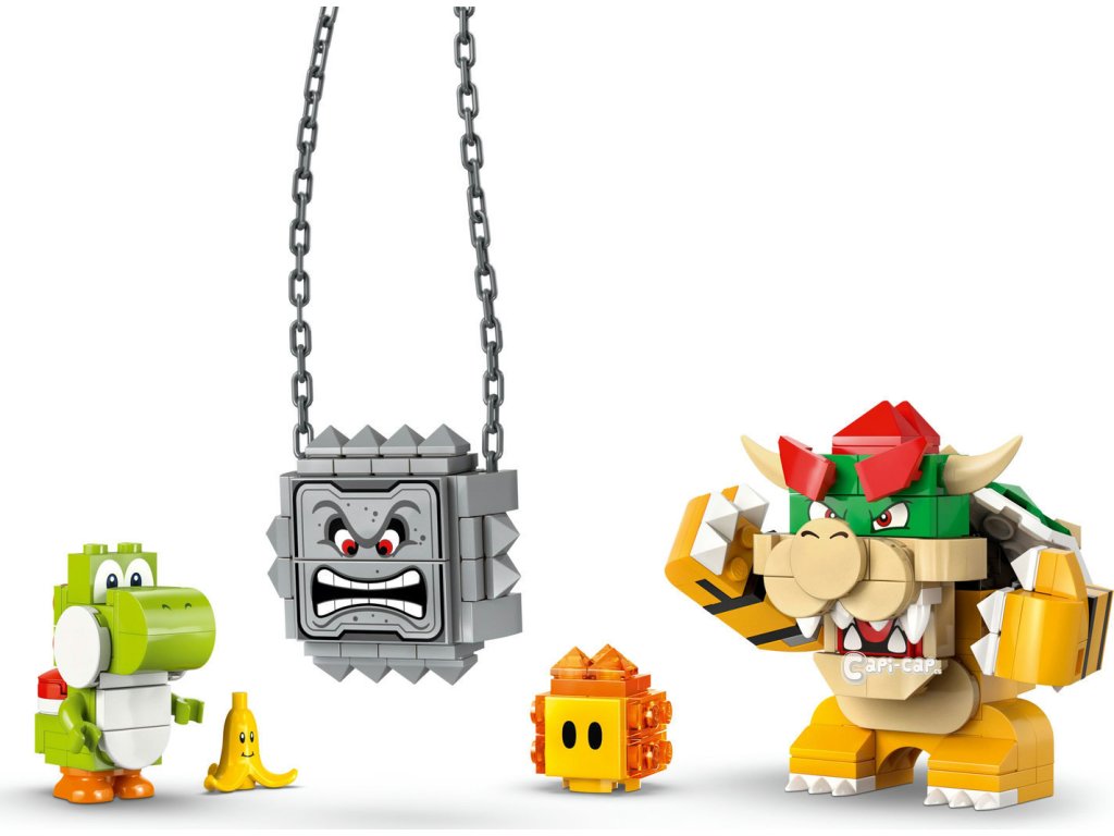 4 figurky LEGO® Super Mario™ – Tato stavebnice Nintendo® LEGO obsahuje figurku Bowsera, Yoshiho, Thwompa a Lava Bubble a prvek Banana s obličejem
