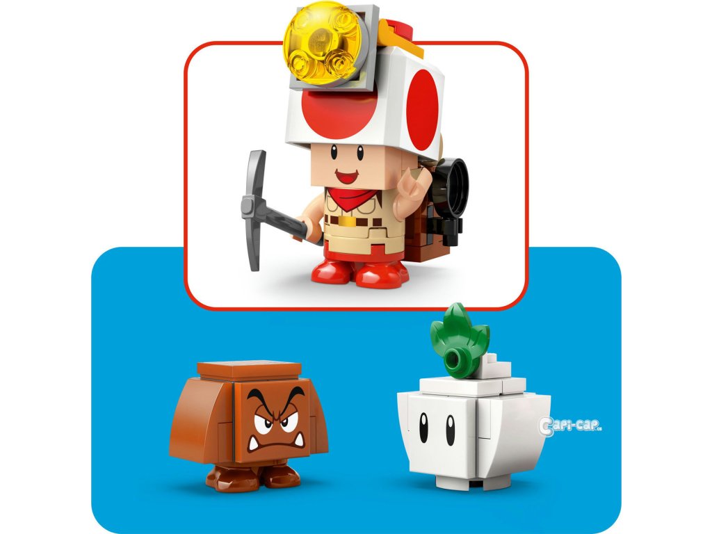 3 figurky LEGO® Super Mario™ pro zábavné hraní – Tato stavebnice Nintendo® LEGO obsahuje Captain Toada, turnip a figurku Goomby, sestavitelný batoh a doplněk v podobě krumpáče, pánve a diamantů
