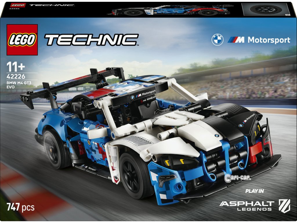 Vystartujte vstříc zábavě s modelem autíčka pro holky a kluky od 11 let. Stavebnice LEGO® Technic Závodní auto BMW M4 GT3 EVO (42226) se pyšní řadou realistických funkcí a zaručeně potěší milovníky aut. Prozkoumejte řízení, šestiválcový motor a otevírací dveře, a pak se nechte uchvátit ikonickým barevným provedením BMW. Stavebnice obsahuje kód, pomocí kterého odemknete digitální verzi tohoto vozu LEGO Technic v online videohře Asphalt Legends. Děti si tak nejprve užijí spoustu zábavy při stavění a hraní s modelem vozidla, a až budou mít chuť na změnu a ještě více zábavy, můžou závodit s digitální verzí auta LEGO ve videohře. Stavebnice LEGO Technic mají realistické mechanismy a funkce pohybu, které snadno uvedou mladé stavitele LEGO do světa STEM. Děti můžou stavět s jistotou díky aplikaci LEGO Builder – přibližujte a otáčejte model ve 3D a sledujte postup pomocí srozumitelného digitálního návodu. Stavebnice obsahuje 747 dílků.