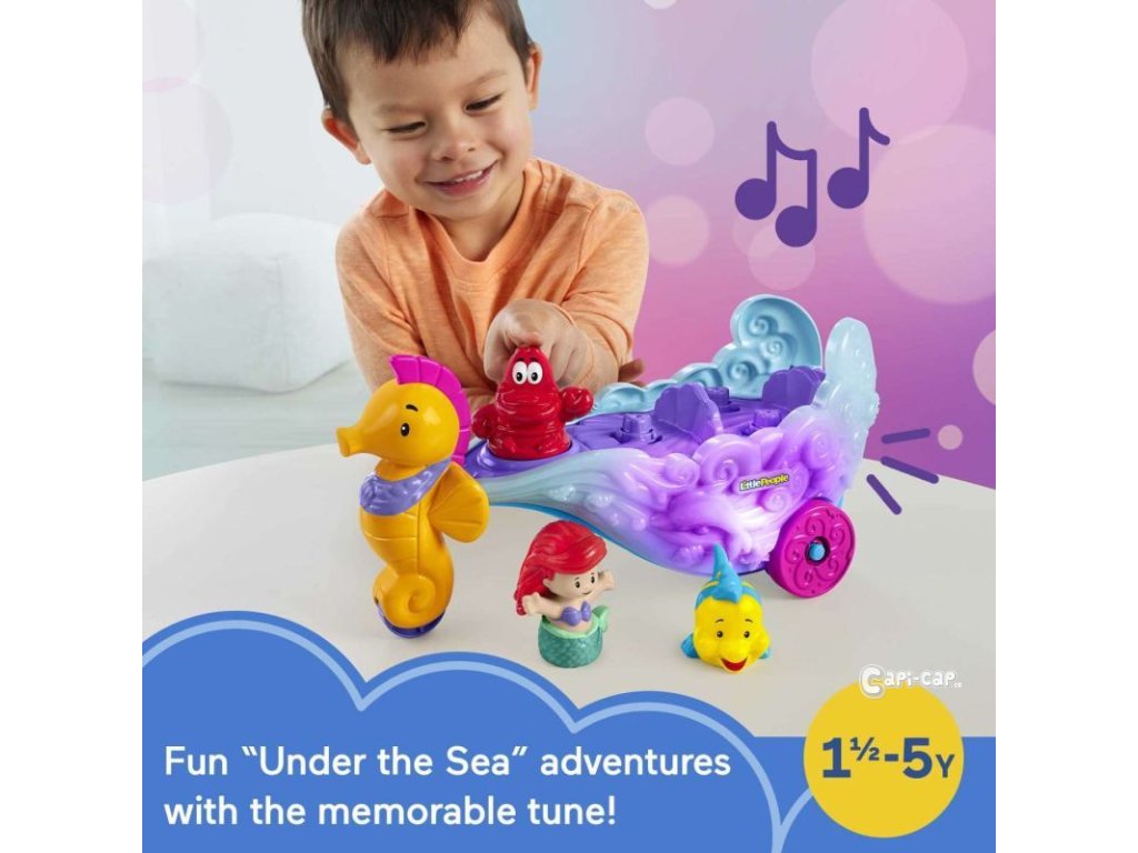 Tento rozkošný kočárek je dodáván se 2 figurkami Little People ve stylu Ariel a Flounder, které mohou jezdit uvnitř. Když děti přitisknou Sebastiana, kočár se rozsvítí zábavnými zvuky a nezapomenutelnou hudbou „Under the Sea“ z Disneyho Malé mořské víly.