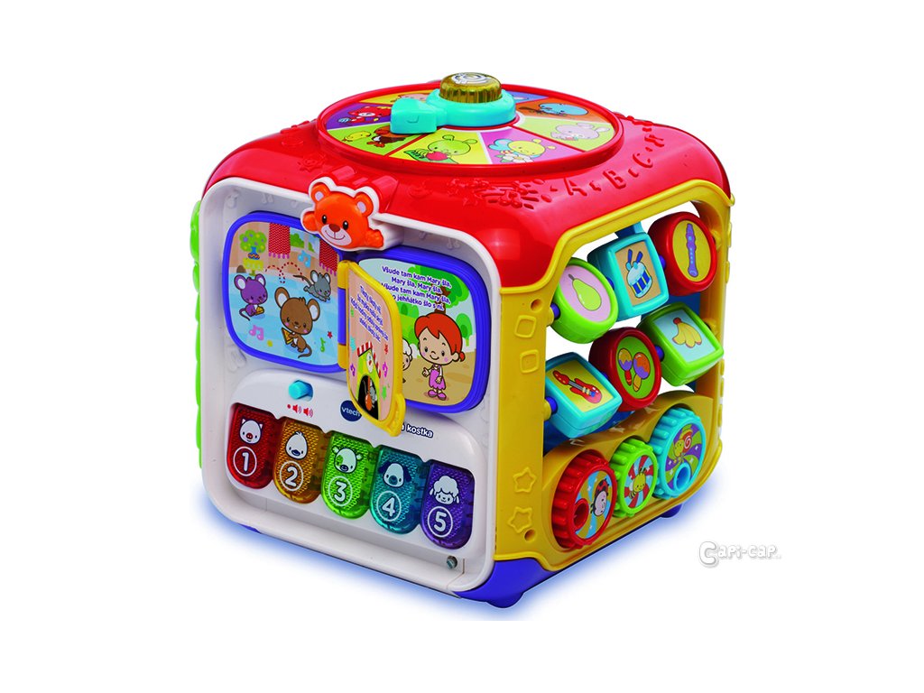 Multifunkční, extrémně zábavná kostka zná více než 75 písní, melodií, zvuků a frází. Učí poznávat zvířátka, barvy, čísla i dětské říkanky. Mnoha způsoby rozvíjí jemnou i hrubou motoriku dítěte, hudební cítění, trpělivost i postřeh. Dítě je za každou svou činnost odměněno povzbuzujícími frázemi, zablikáním nebo zábavnými zvuky. Vysoce odolný design hračky spolu s precizním provedením, dává dítěti tu nejvyšší možnou hodnotu, kterou je možné od hračky očekávat. Barevné tvary na vkládání jsou součástí kostky.