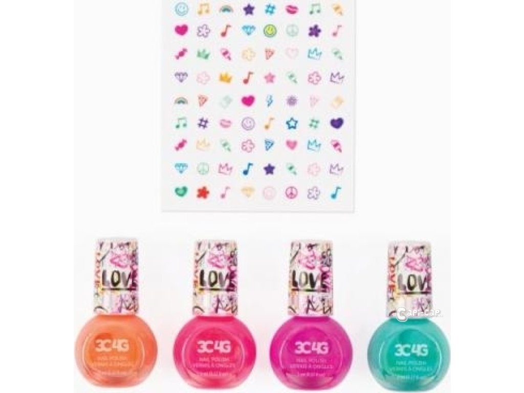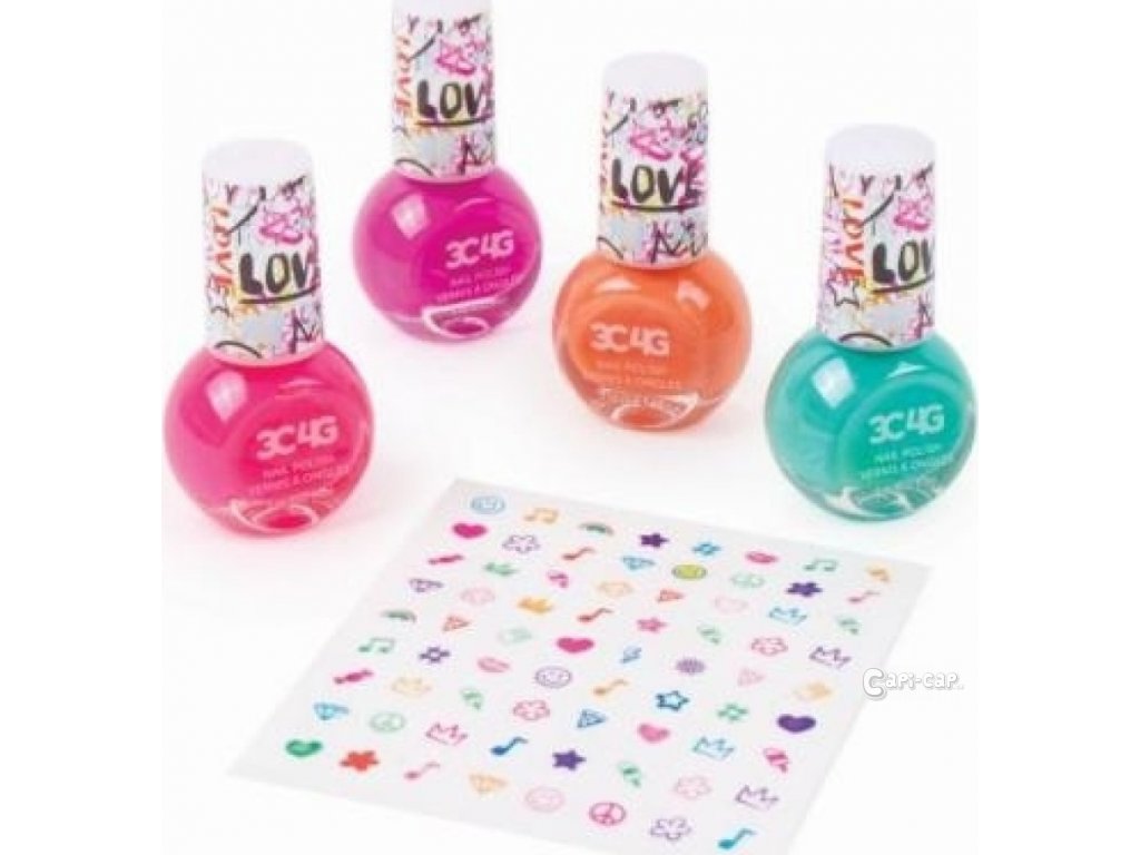 Sada obsahuje 4 laky na nehty o objemu 5ml a jeden arch samolepek na nehty.