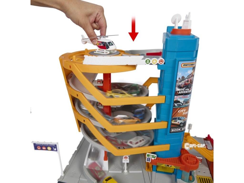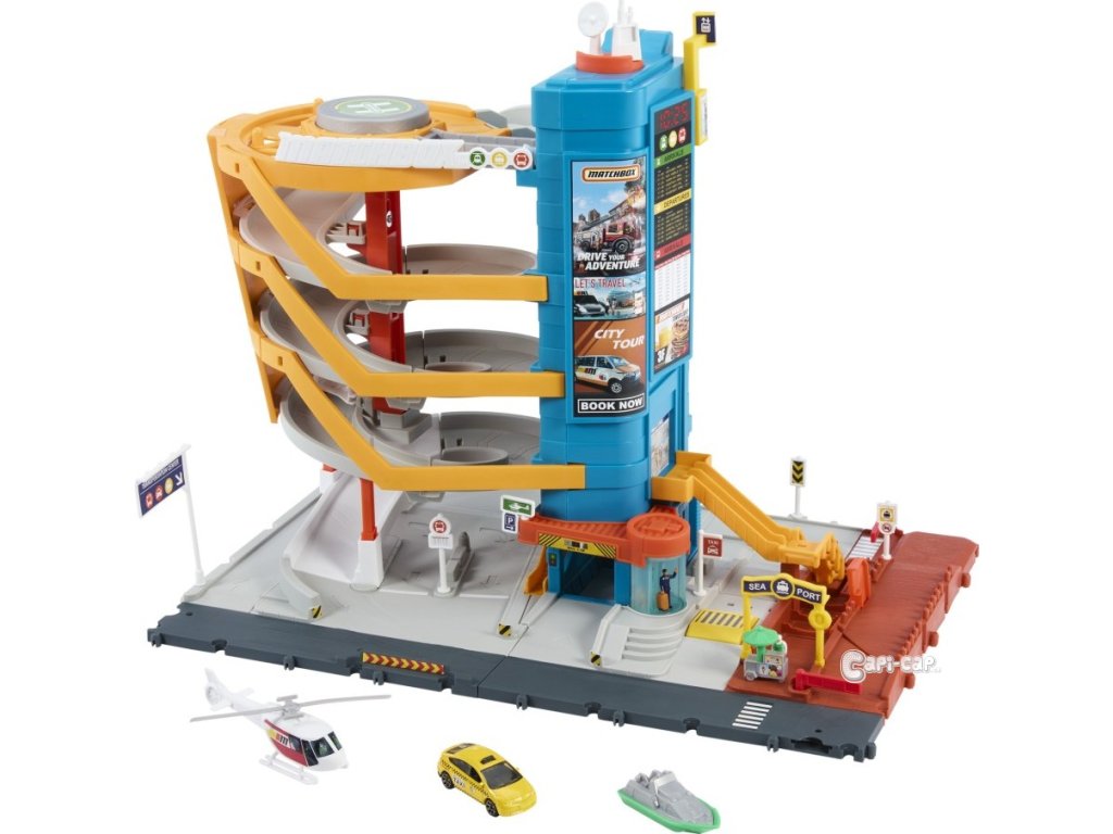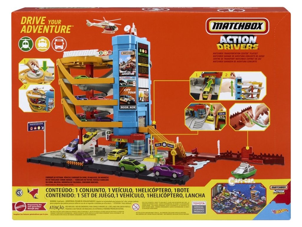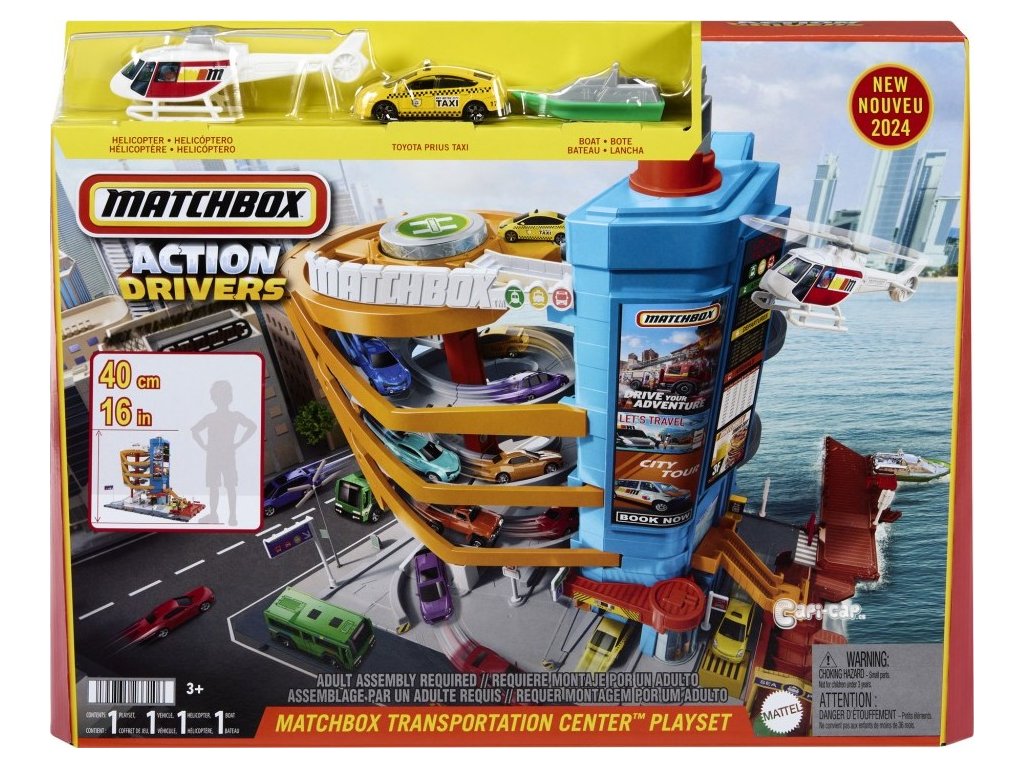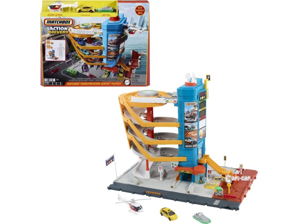 Vydejte se na vzrušující dobrodružství na zemi, ve vzduchu nebo na moři s dopravním centrem Matchbox™. Tento velkolepý herní set obsahuje pětiúrovňovou garáž, přístaviště lodí a přistávací plochu pro vrtulníky a jeho součástí je taxík, loď a vrtulník v měřítku 1:64 pro realistické vyprávění příběhů. Zajeďte k nástupní zóně pro cestující, abyste spustili otáčecí dveře a odhalili přijíždějící pasažéry. Vyjeďte výtahem poháněným dětmi do parkovacího objektu, který pojme 12 angličáků a když vrtulník přistane na heliportu, pošle vozidla přes garáž dolů a ven do ostrého provozu. V námořním přístavu se most vyklopí a vytvoří molo, čímž rozšíří scénu o další příběhové možnosti. Barvy a provedení se mohou lišit.