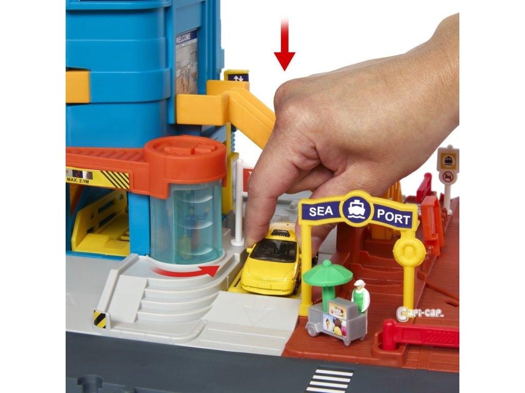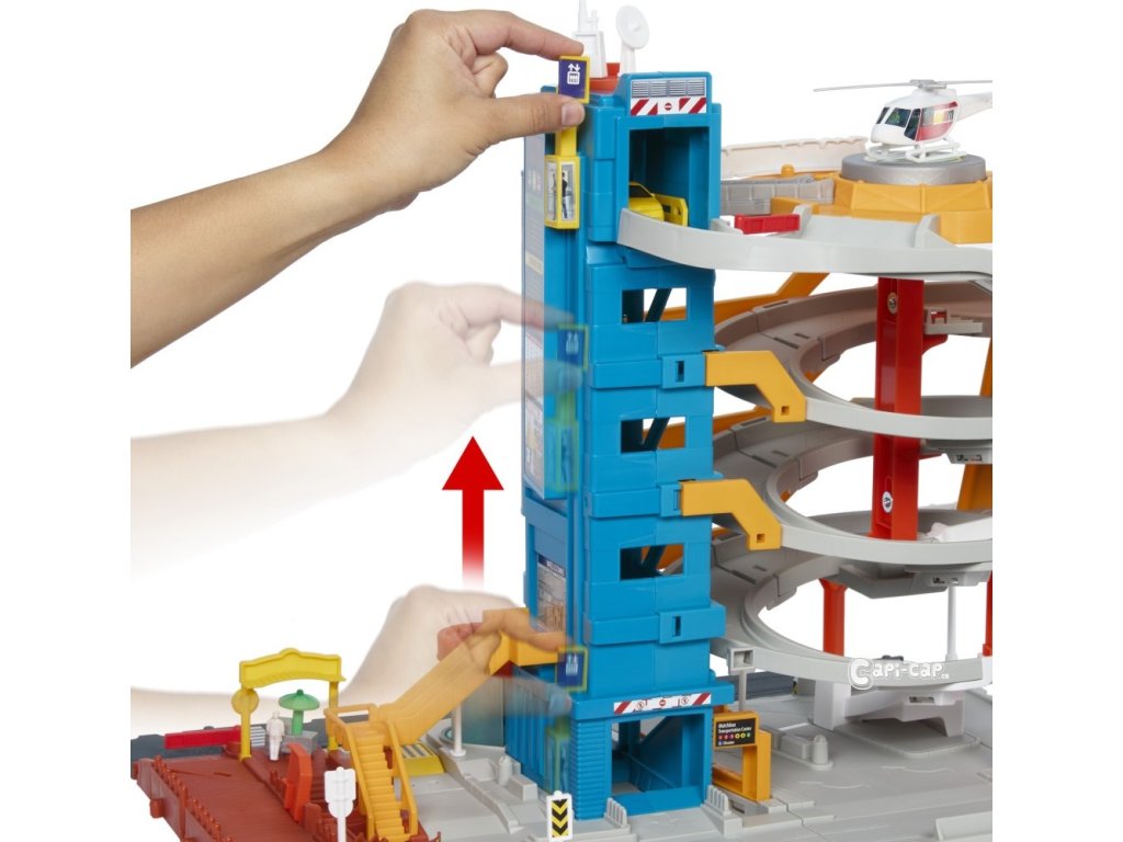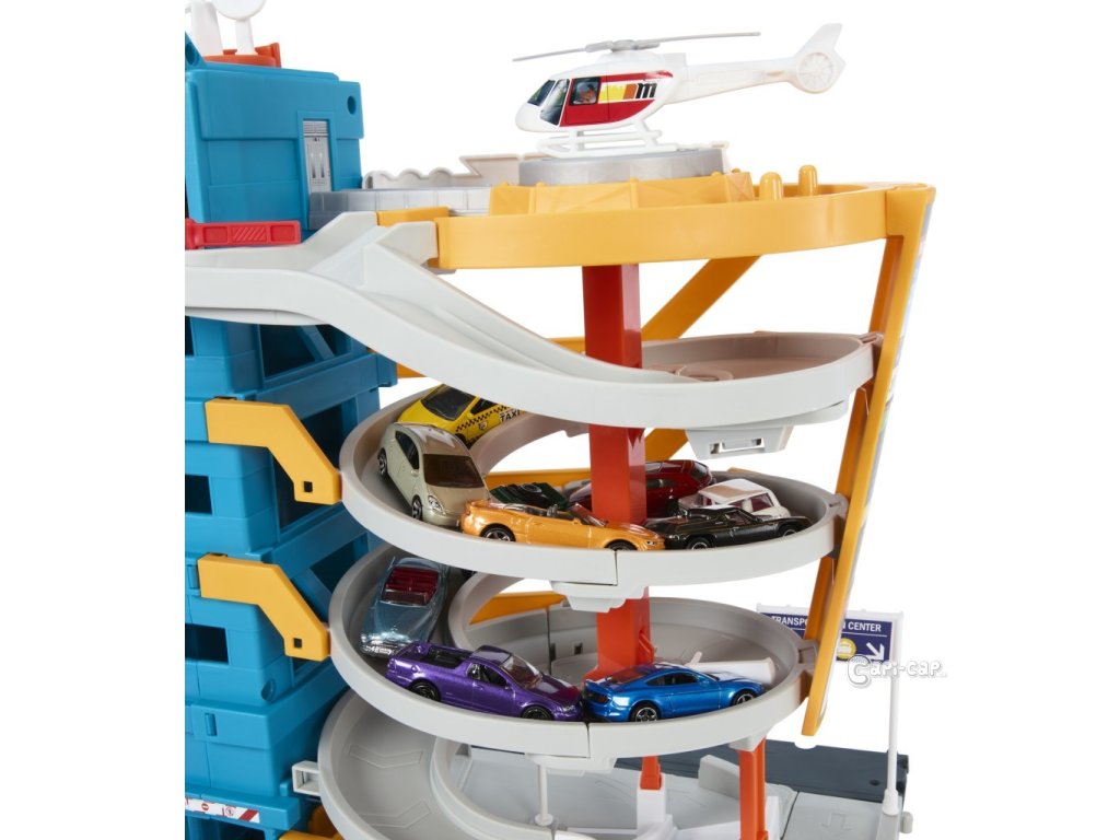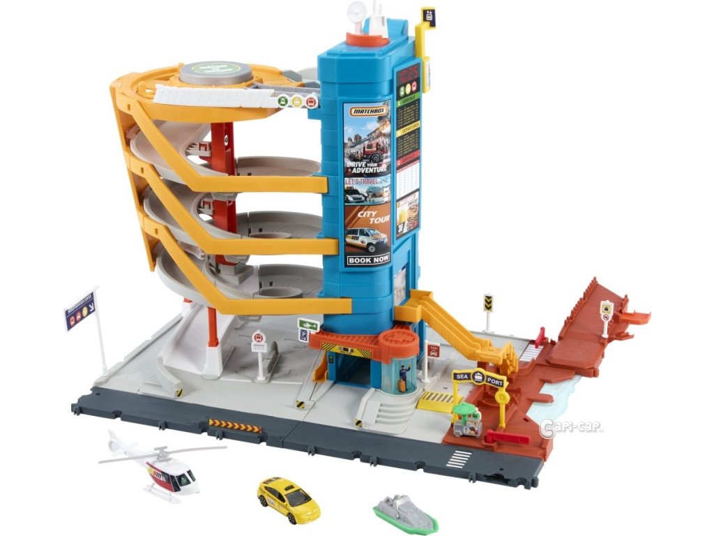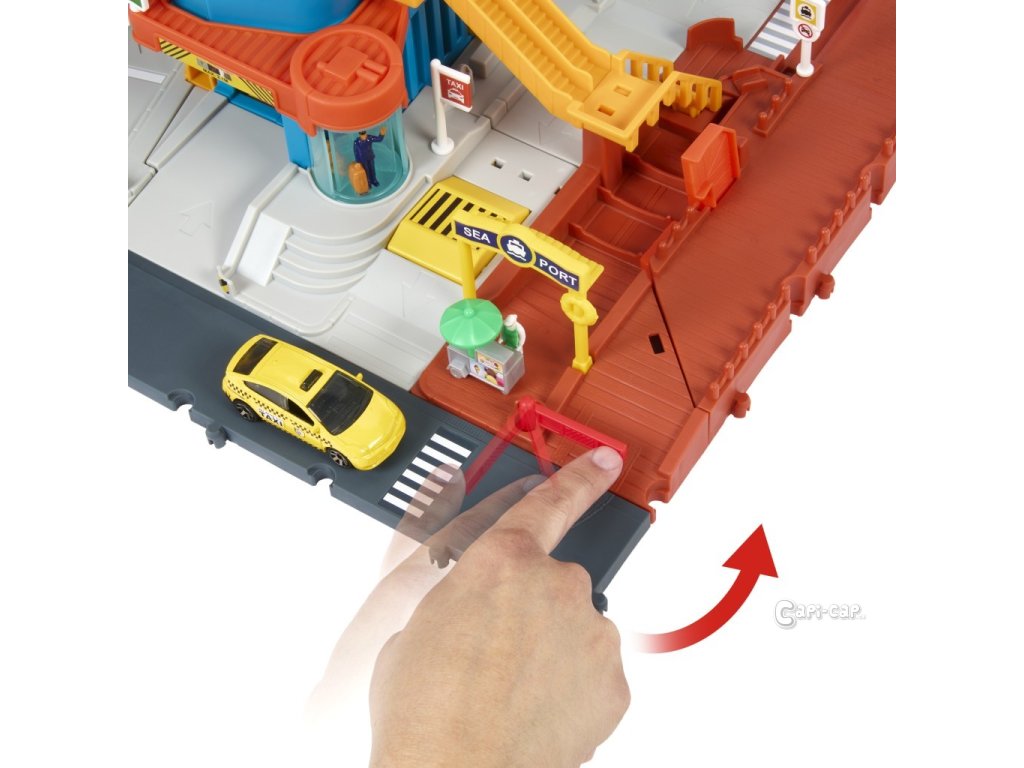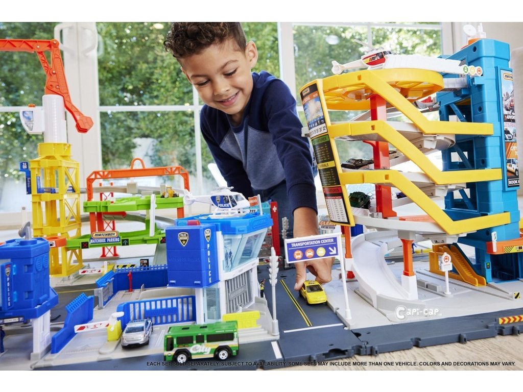 Vydejte se na vzrušující dobrodružství na zemi, ve vzduchu nebo na moři s dopravním centrem Matchbox™. Tento velkolepý herní set obsahuje pětiúrovňovou garáž, přístaviště lodí a přistávací plochu pro vrtulníky a jeho součástí je taxík, loď a vrtulník v měřítku 1:64 pro realistické vyprávění příběhů. Zajeďte k nástupní zóně pro cestující, abyste spustili otáčecí dveře a odhalili přijíždějící pasažéry. Vyjeďte výtahem poháněným dětmi do parkovacího objektu, který pojme 12 angličáků a když vrtulník přistane na heliportu, pošle vozidla přes garáž dolů a ven do ostrého provozu. V námořním přístavu se most vyklopí a vytvoří molo, čímž rozšíří scénu o další příběhové možnosti. Barvy a provedení se mohou lišit.
