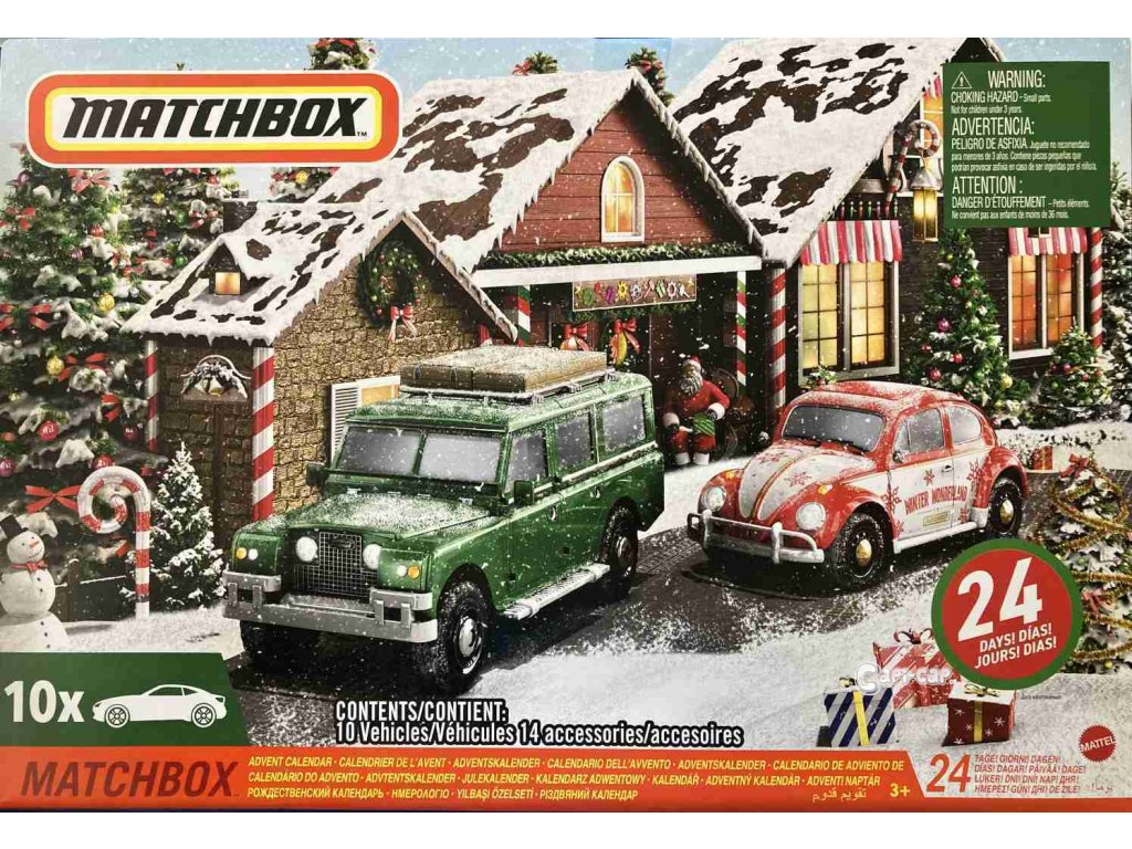 Kalendář obsahuje 10 autíček Matchbox a 14 doplňků.