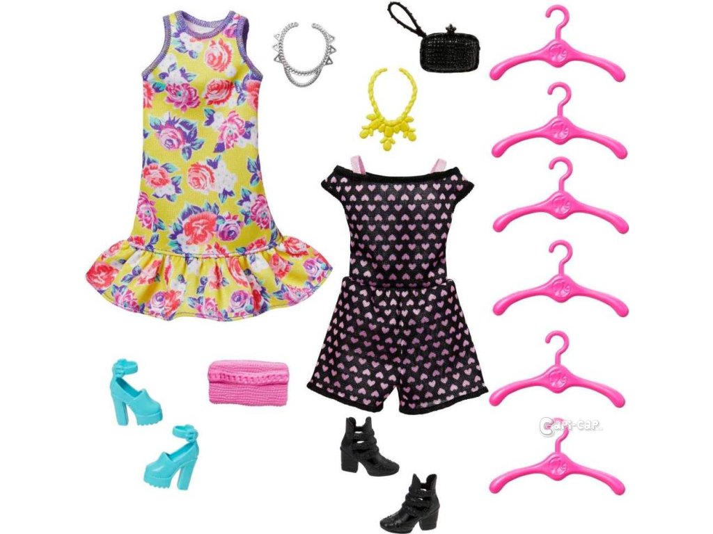 Fialová šatní skříň s růžovým interiérem navržená v typickém stylu Barbie® má dvojité průhledné dveře, které vám umožní nahlédnout dovnitř. Panenka Barbie® je oblečená v pruhovaných šatech a botách a má také další oblečení a doplňky. Tyto zahrnují dvoje šaty s moderními potisky a oblíbenými barvami, ideální na den i večer, dva páry bot, dva náhrdelníky a dvě kabelky. Velký skládací věšák slouží k zavěšení oblečení a umožňuje rychlou změnu stylu. Sada obsahuje také 6 věšáků.