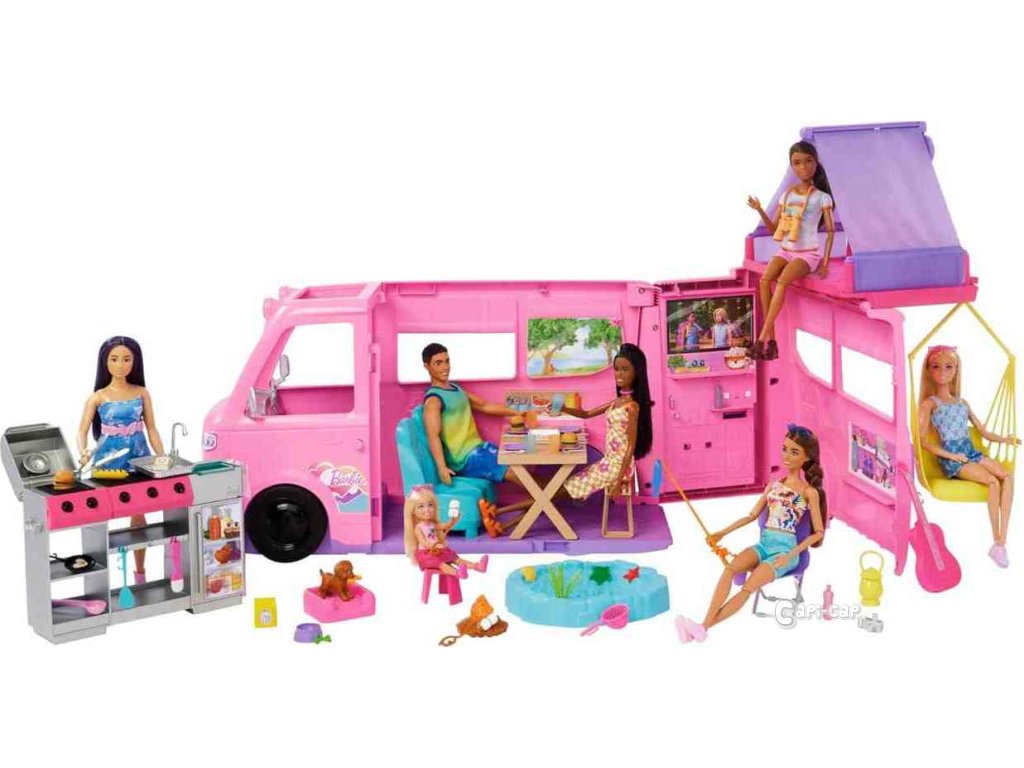 Dobrodružství volá! Herní set Barbie Karavan snů se stanem přináší sedm hracích zón a více než 60 doplňků pro spoustu zábavy pod širým nebem! Stačí karavan postrčit a vydat se vstříc. Když přijde čas na večeři, použijte přiložené „těsto“ a vytvořte lahodné burgery pro Barbie a její kamarády (panenky se prodávají samostatně) nebo rozpalte gril – díky speciálnímu efektu změny barvy uvidíte, jak se jídlo „opéká“ přímo před očima! Barbie Karavan snů je ideálním dárkem pro děti od 3 let, zvlášť pro ty, které milují přírodu a dobrodružství. Panenky nejsou součástí balení. Barvy a vzhled výrobku se mohou lišit.