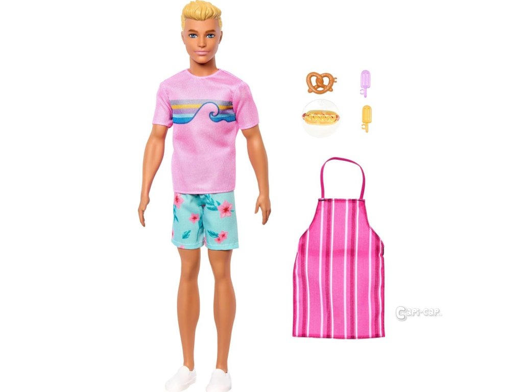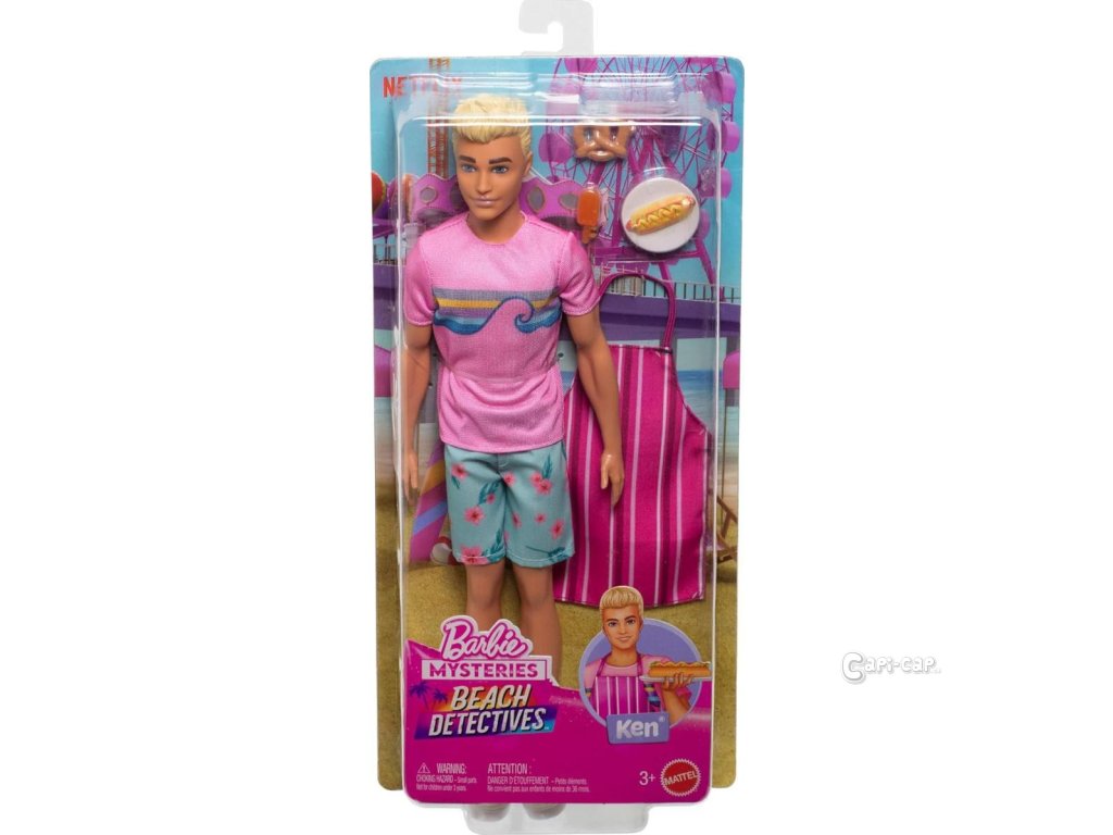 Má na sobě růžové tričko s grafikou, ležérní kraťasy s květinovým potiskem a své typické bílé tenisky. Děti poznají pruhovanou zástěru panenky Kena z obrazovky – pomozte mu ji natáhnout a naservírovat klasické pochutiny z promenády! Doplňky k pochutinám – včetně preclíku, párku v rohlíku a 2 hracích figurek s mraženými pamlsky – umocňují zábavu při vyprávění příběhu. Panenky a hračky z filmu Barbie Mysteries: Beach Detectives jsou plné příležitostí k dobrodružství a představují skvělý dárek.