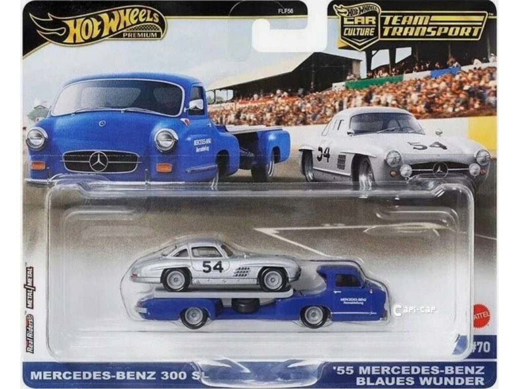 Balení Hot Wheels Premium ukrývá 2 vozidla – nákladní automobil s platformou: Mercedes-Benz 300 SL a Mercedes-Benz Blaues Wunder. Autíčka představují detailně reprodukované modely v měřítku 1:64 a jistě se stanou ideální nabídkou pro každého sběratele a milovníka autíček Hot Wheels. Naložte vybrané autíčko na odtahový vůz a vydejte se na cestu!