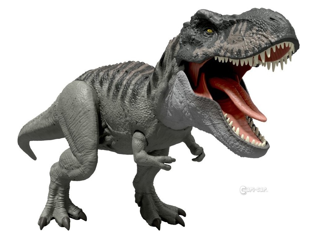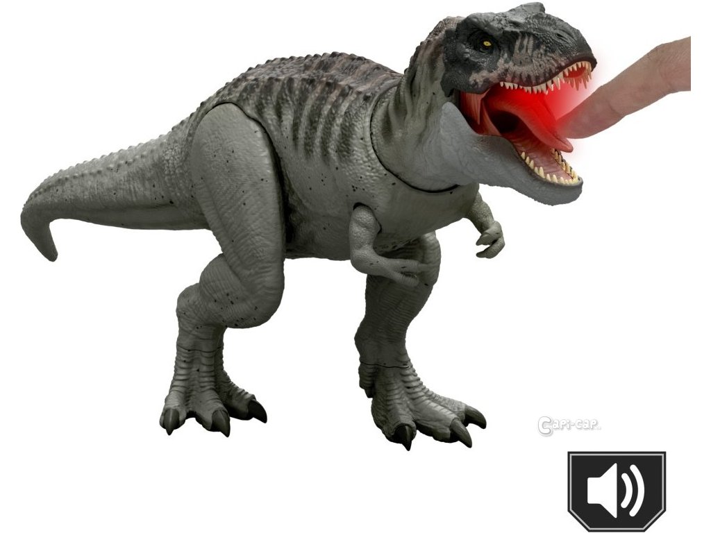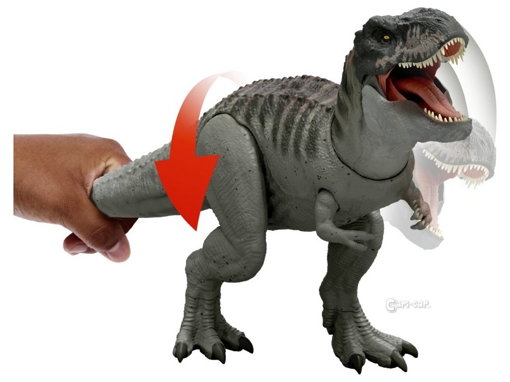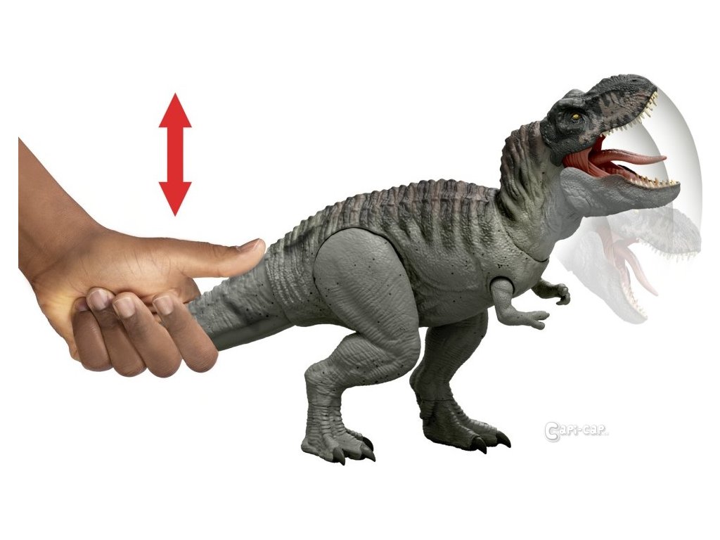 Tento Tyrannosaurus rex inspirovaný filmem přináší ultimátní bojovou akci s nepřetržitým kousáním, světly a děsivým řevem. Stisknutím jazyka jednou T-Rex zařve, ale pokud jazyk podržíte prstem nebo figurkou jiného dinosaura, spustí se divoké sekvence kousání, zvuků a světelných efektů. Pohybem ocasu aktivujete útok z různých směrů! Tento 53 cm dlouhý masožravec potěší všechny malé milovníky dinosaurů od 4 let. Naskenujte kód na noze v aplikaci Jurassic World Play a přidejte si T-Rexe do své digitální sbírky!