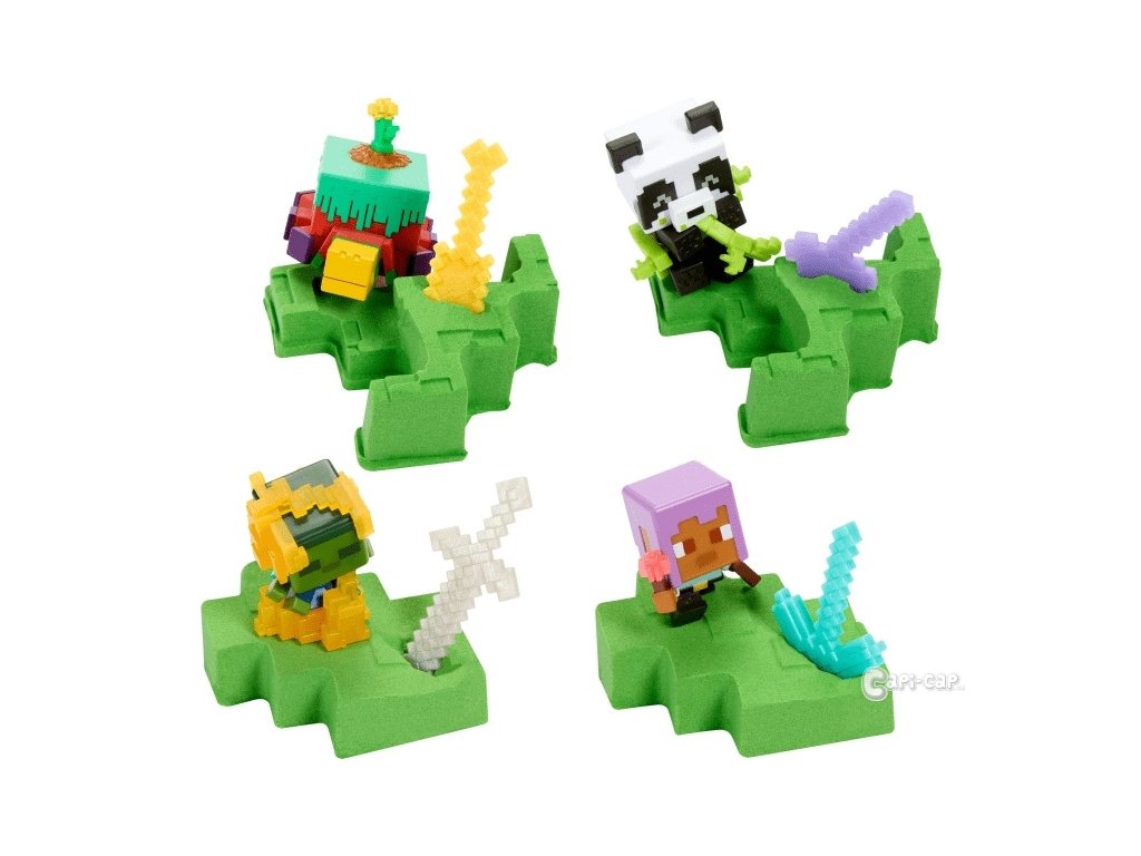 Otevřete opakovaně použitelnou schránku ve tvaru meče z Minecraftu a objevte uvnitř minifigurku v animované póze určené k vyprávění příběhů. Navíc je každá figurka dodávána s těžebním doplňkem a formovatelným pískem, který lze přeměnit na různé tvary.